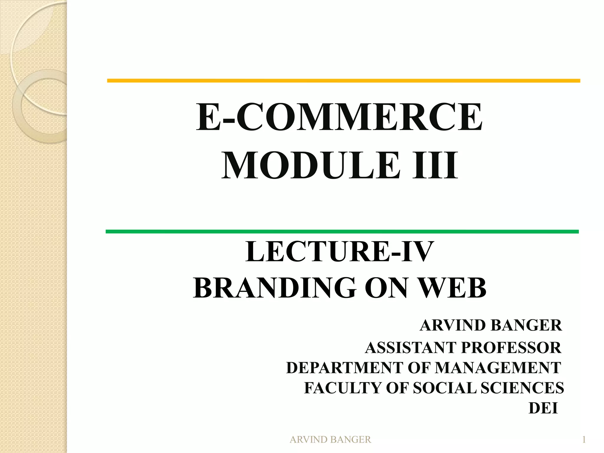 This document summarizes key concepts about branding on the web from a lecture. It defines branding and discusses the importance of developing brand identity, equity, and uniformity online. It notes challenges like protecting brands from misuse as information spreads quickly online. The document outlines best practices for building successful brands, including choosing brand elements, developing a brand strategy in steps, and maintaining consistency. It emphasizes the importance of differentiation, relevance and perceived value in online branding.
