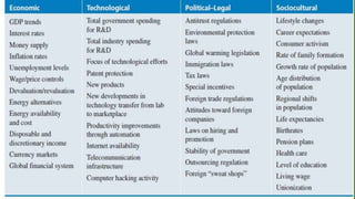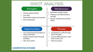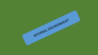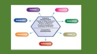 The document discusses environmental scanning and analysis for strategic management. It defines the internal and external environment and describes several approaches to environmental scanning. The external environment includes political, economic, social, technological, environmental, and legal factors. The internal environment comprises the organization's resources and capabilities. A SWOT analysis identifies the strengths, weaknesses, opportunities, and threats to help formulate strategies. Conducting environmental analysis is important for strategy formulation and performance.