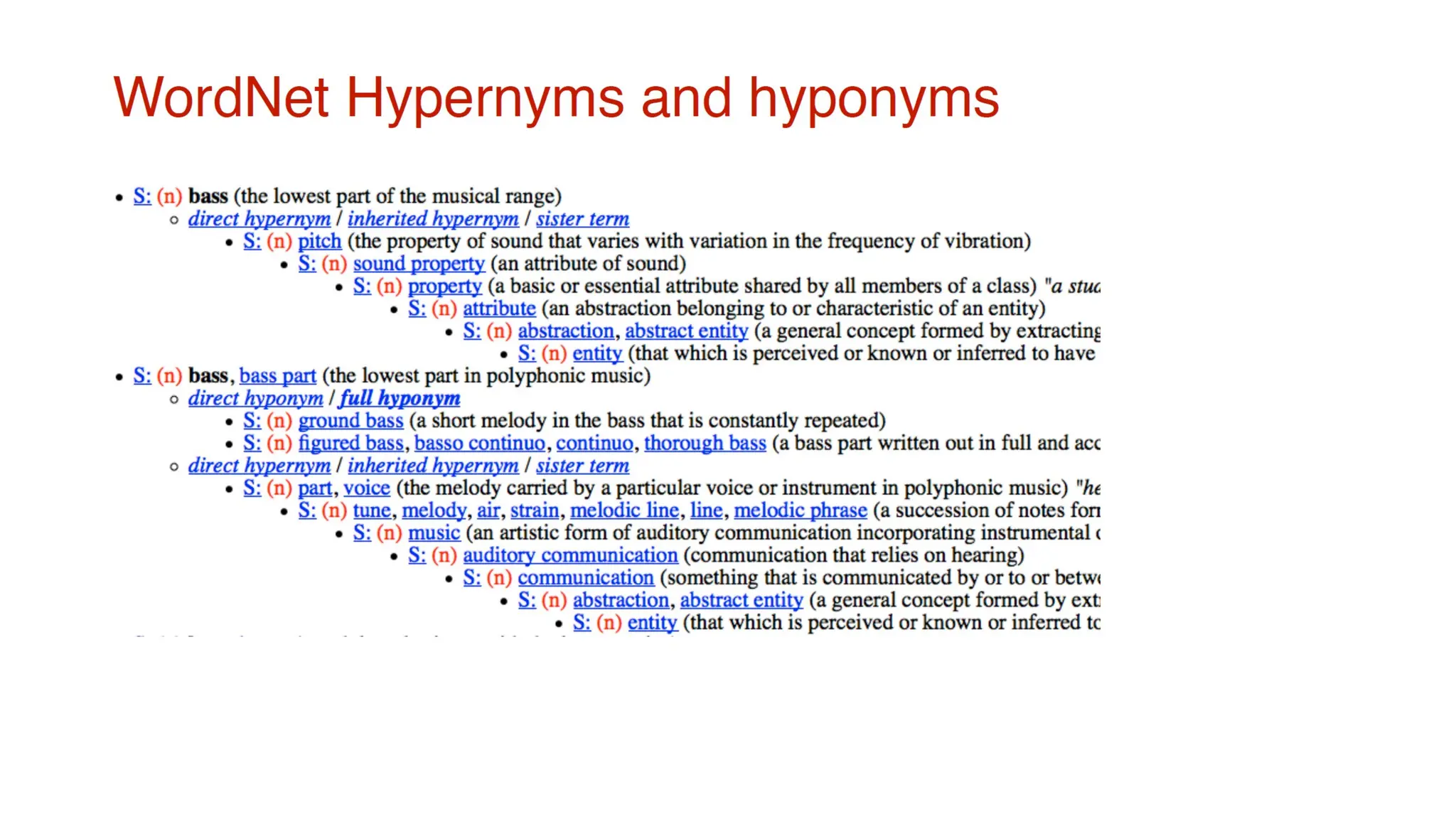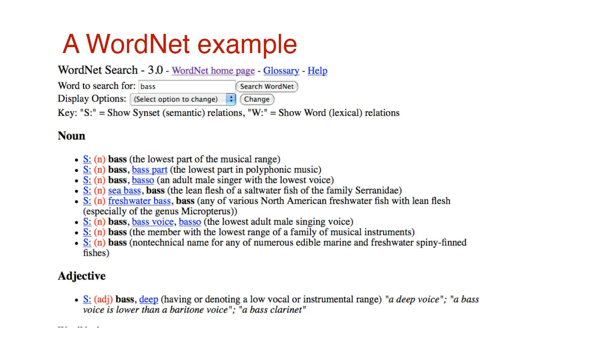 synsets are an important primitive in WordNet. The entry for bass includes synsets like