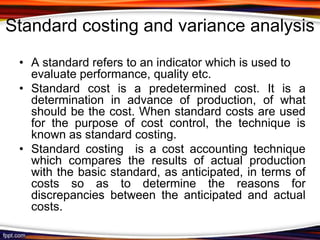 The document provides an overview of budgeting and budgetary control, focusing on standard costing and variance analysis for cost control and reduction. It explains the methodology for setting standard costs for materials, labor, and overheads, while detailing the computation and classification of various variances such as material, labor, and overhead variances. Additionally, it covers sales variances and their implications on profitability, emphasizing the distinction between favorable and unfavorable variances.
