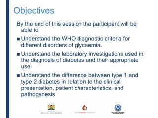 The document outlines the classification and diagnosis of diabetes, focusing on WHO criteria and the differences between type 1 and type 2 diabetes. It emphasizes that classification is based on disease pathogenesis rather than insulin dependence and details the clinical presentation, patient characteristics, and diagnostic criteria for different diabetes types. Additionally, it highlights the importance of capillary blood glucose monitoring and the management of impaired glucose tolerance and fasting glucose as risk factors for cardiovascular disease.