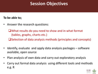 1) The objectives of translating research questions into an analysis plan, identifying appropriate data analysis methods and software, and conducting exploratory analysis.