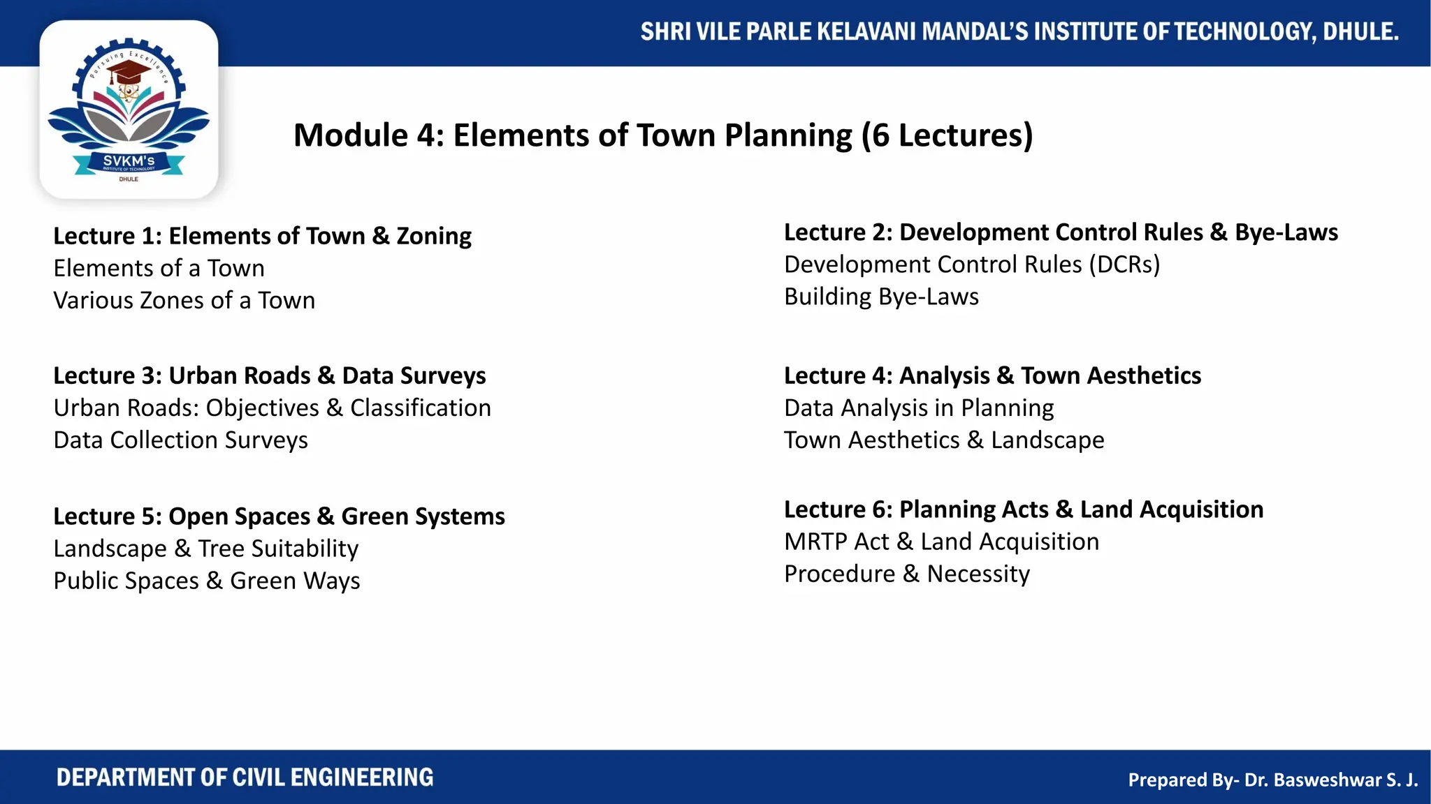 Elements of Town, Various Zones, Development Control Rules and Building Bye Laws, Urban Roads: Objective, Classification, Road Networks, Data Collection Surveys, Analysis of data,
