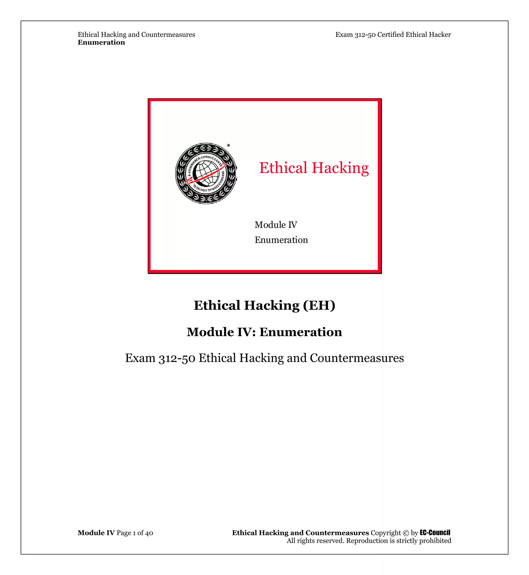This document covers the enumeration phase of ethical hacking, focusing on techniques and countermeasures for exploiting systems, specifically Windows 2000. It details methods of gathering information such as network resources, users, and groups through attacks like null sessions and SMB enumeration. The importance of understanding these concepts is emphasized for security professionals to implement effective countermeasures against potential intrusions.