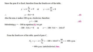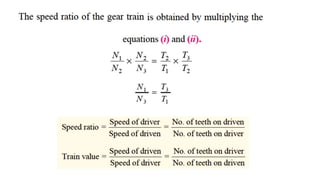 This document discusses different types of gear trains including simple, compound, reverted, and epicyclic gear trains. It provides details on the components, configurations, terminology, and methods for calculating speed and velocity ratios for each type of gear train. Key points covered include how simple gear trains involve one gear on each shaft, compound gear trains have multiple gears on a shaft, reverted gear trains have coaxial input and output shafts, and epicyclic gear trains allow shaft axes to move relative to a fixed axis. Formulas and a tabular method are presented for analyzing epicyclic gear trains.
