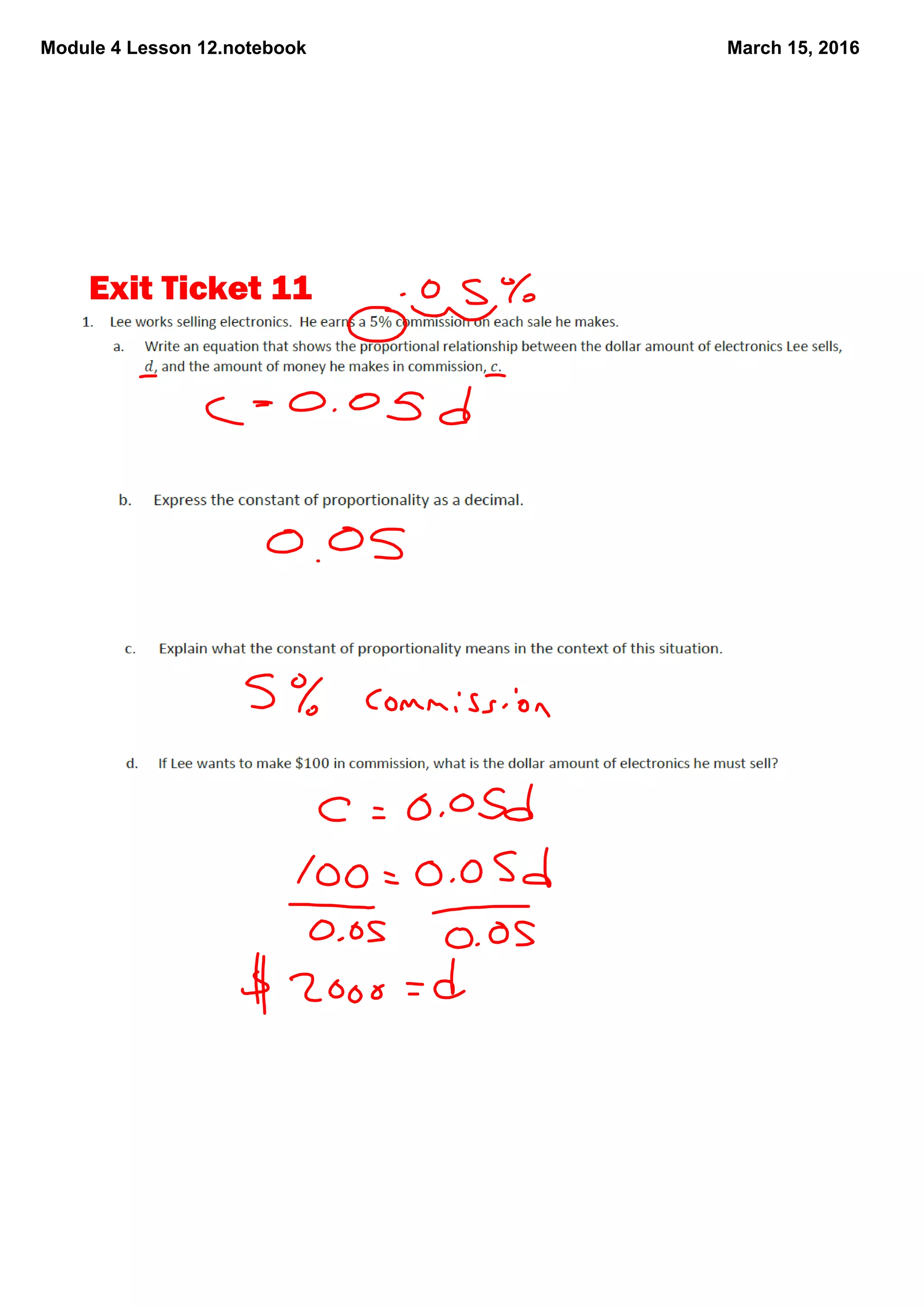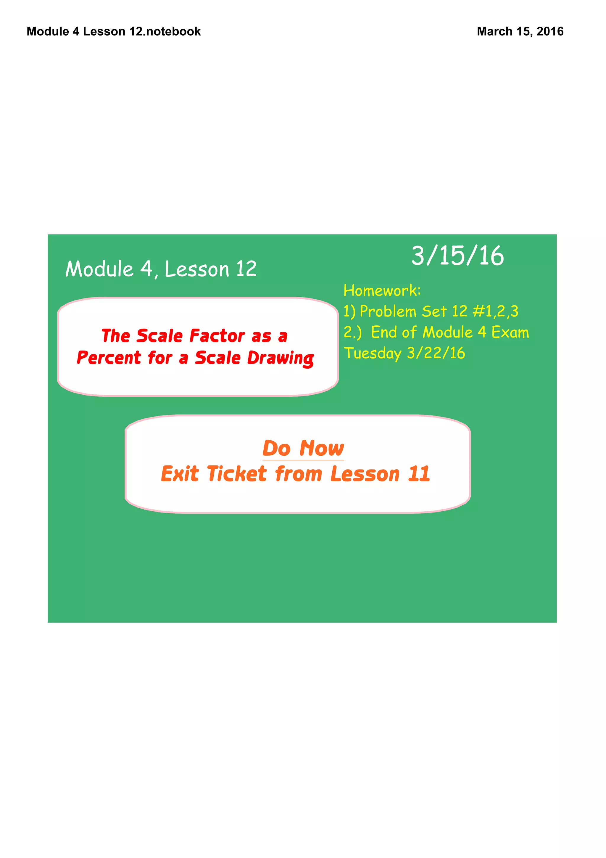 This document contains notes from a math lesson on scale drawings and scale factors. It includes the homework assigned, which was to complete problems from Problem Set 12 and prepare for an end of module exam. The lesson notes cover calculating and applying scale factors to create scale drawings, including the possibility of using different horizontal and vertical scale factors.