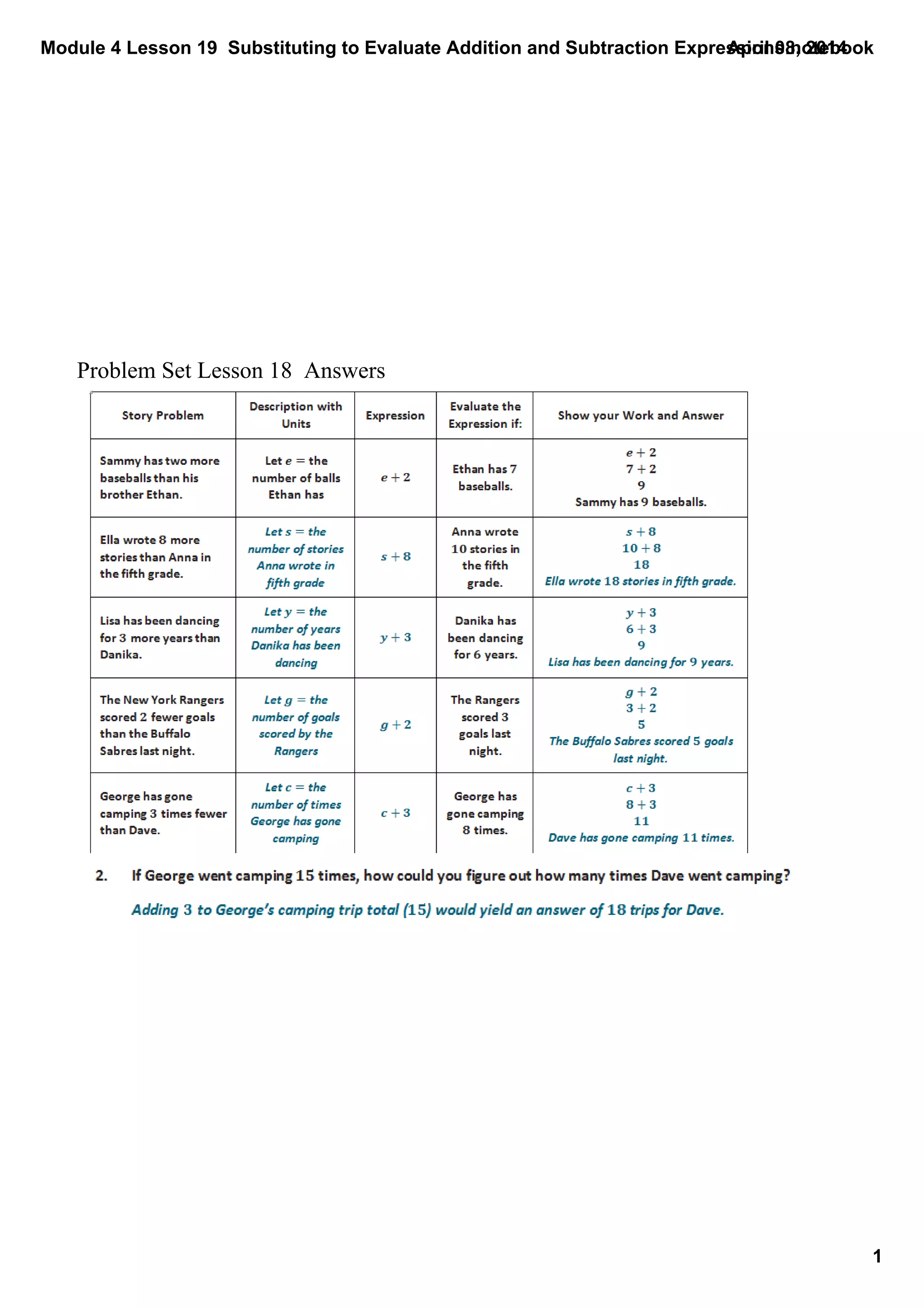 This document contains a lesson on evaluating addition and subtraction expressions by substituting values. It includes examples of writing expressions to describe relationships between ages of siblings and developing tables to evaluate the expressions. Students are asked to solve word problems by setting up expressions with variables and calculating values. The lesson concludes with exit ticket questions about writing expressions and the relationship between addition and subtraction.