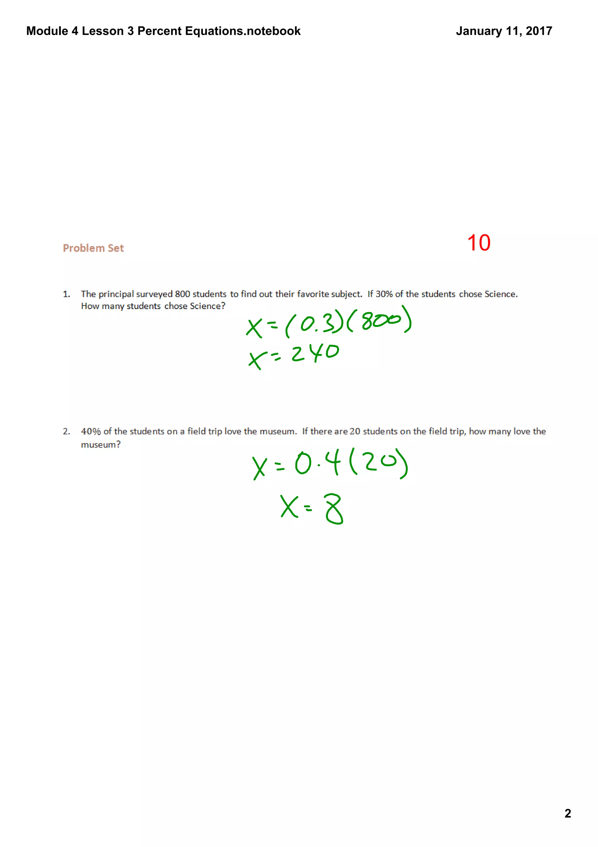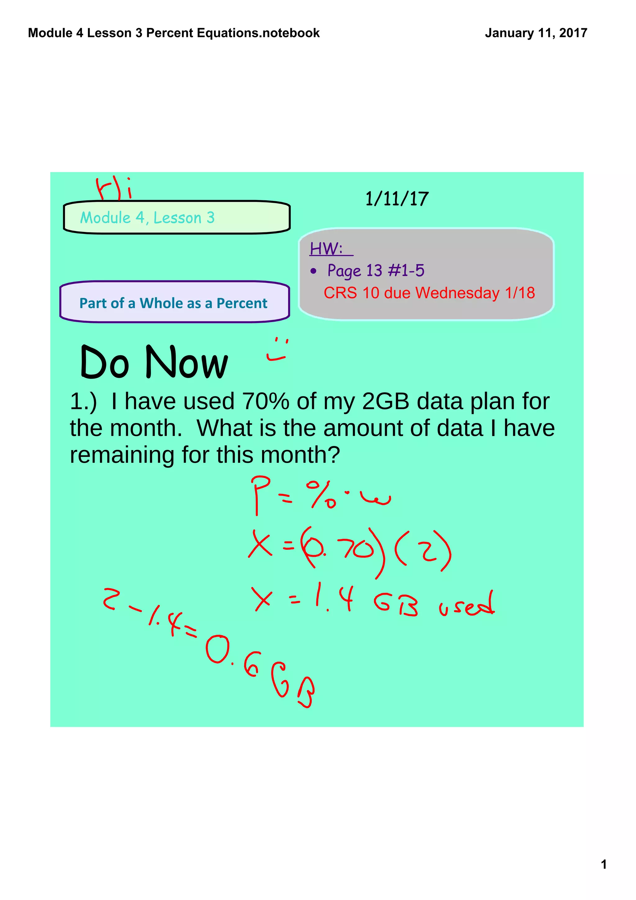This document contains notes from a math lesson on solving percent equations. It includes examples of using percentages to calculate amounts, such as calculating remaining data based on a percentage of data used. It also provides homework assignments and explains how to use a visual model or equation to calculate total calories from sugar given a percentage of total calories.