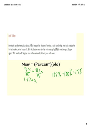 This document contains notes from a math lesson on using percentages to solve word problems. It includes examples of using the part-to-whole percentage calculation to find total amounts when given a percentage. There are also practice problems for students to solve using mental math that involve calculating total values when given that a number is a certain percentage of the total. The document closes by asking students to reflect on different methods for solving percentage problems.