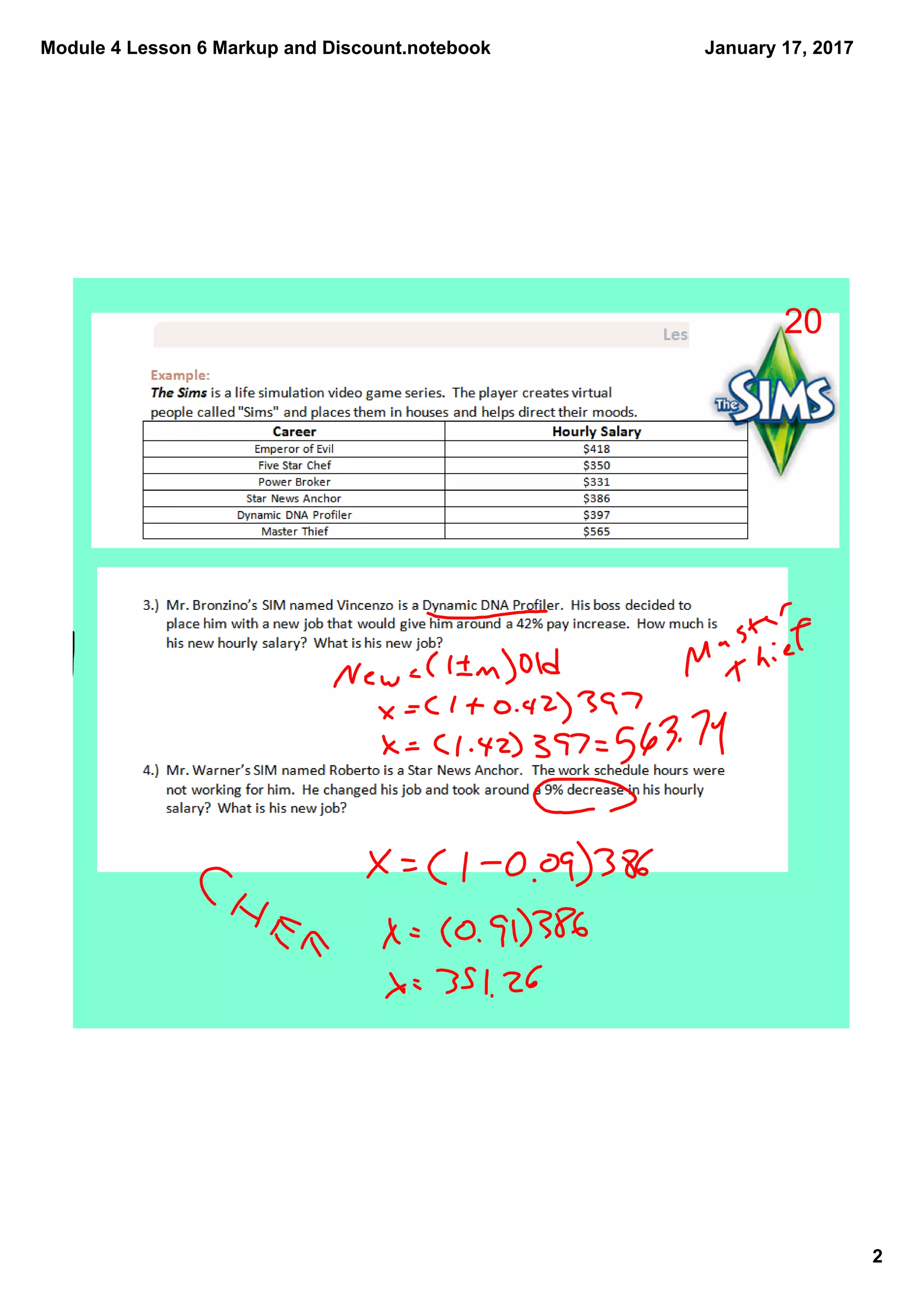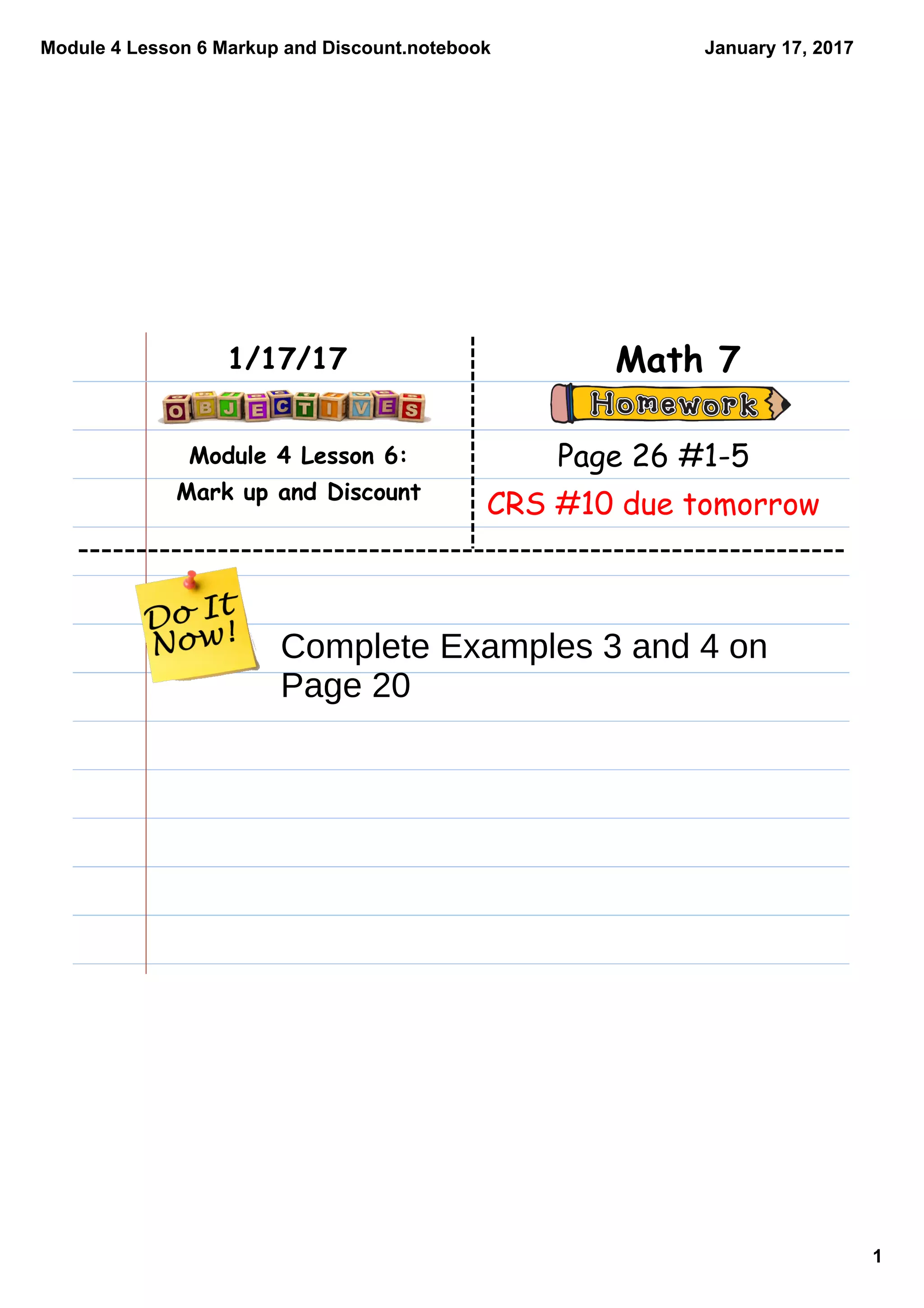 This document is from a notebook on markup and discount that provides instructions for students. It mentions completing examples 3 and 4 on page 20, having a CRS assignment due the next day, and includes pages of problems from lessons 5 and 6 related to markup and discount.