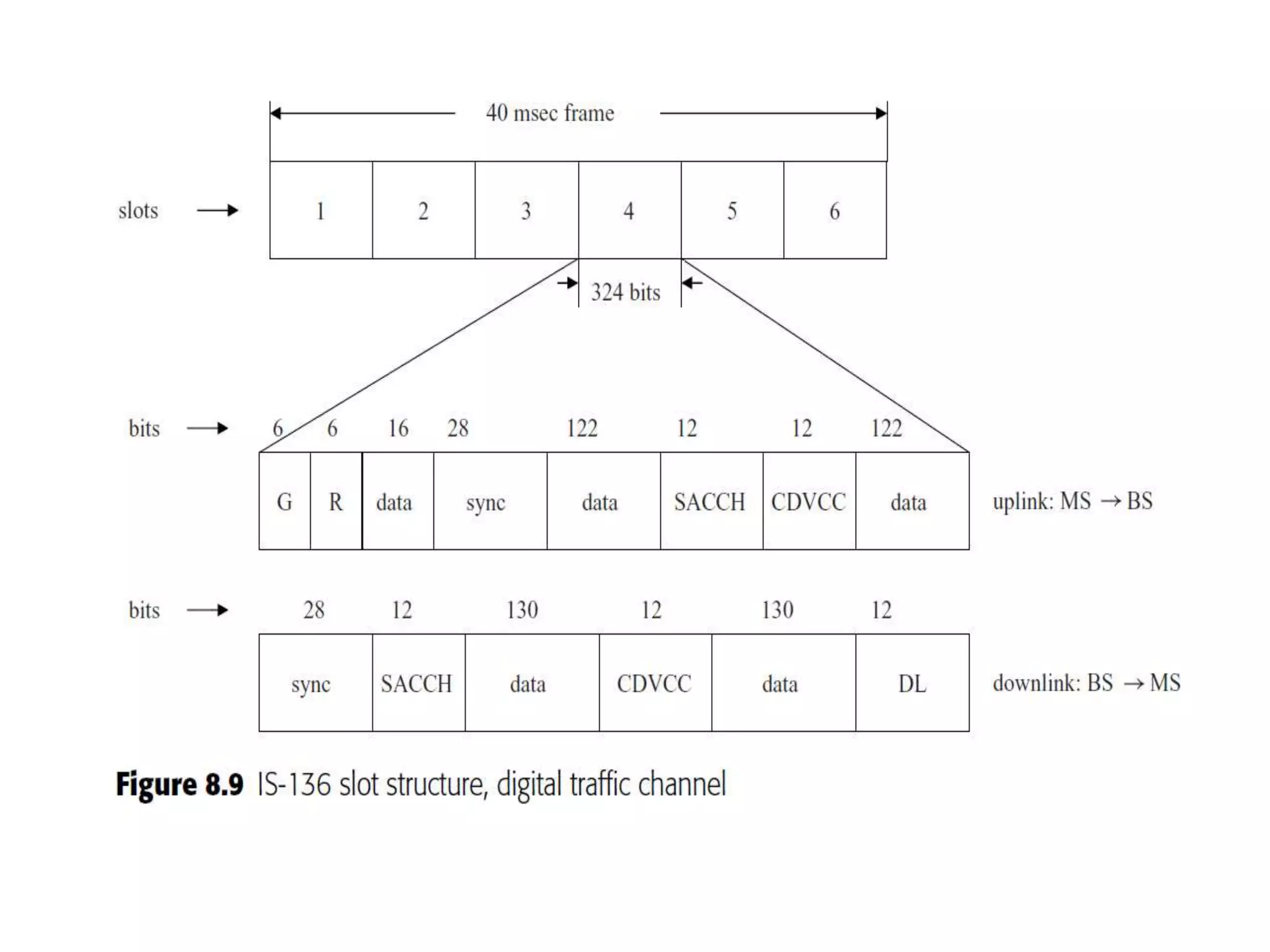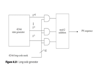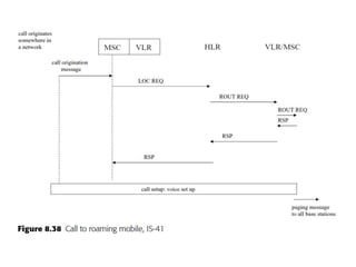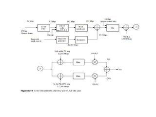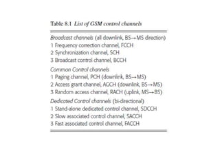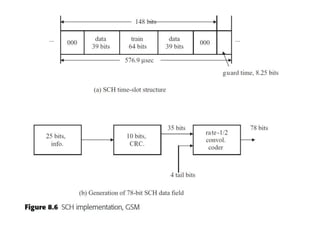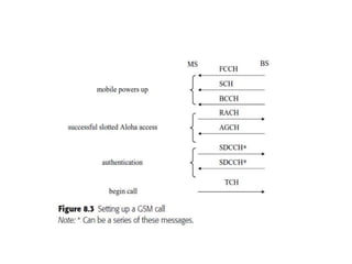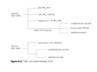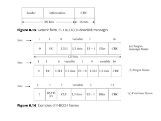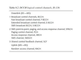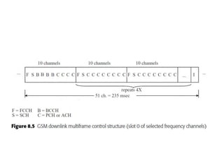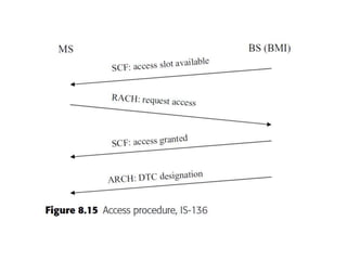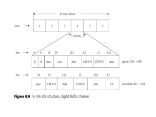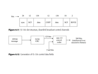 This document summarizes key aspects of second-generation digital wireless systems including TDMA-based IS-136 and GSM as well as CDMA-based IS-95. It describes the basic infrastructure components including base stations, mobile switching centers, home and visitor location registers. It also provides overviews of channel structures and framing in GSM, IS-136 and IS-95 including descriptions of broadcast, traffic and control channels. Mobile registration, authentication and handoff procedures are also summarized.