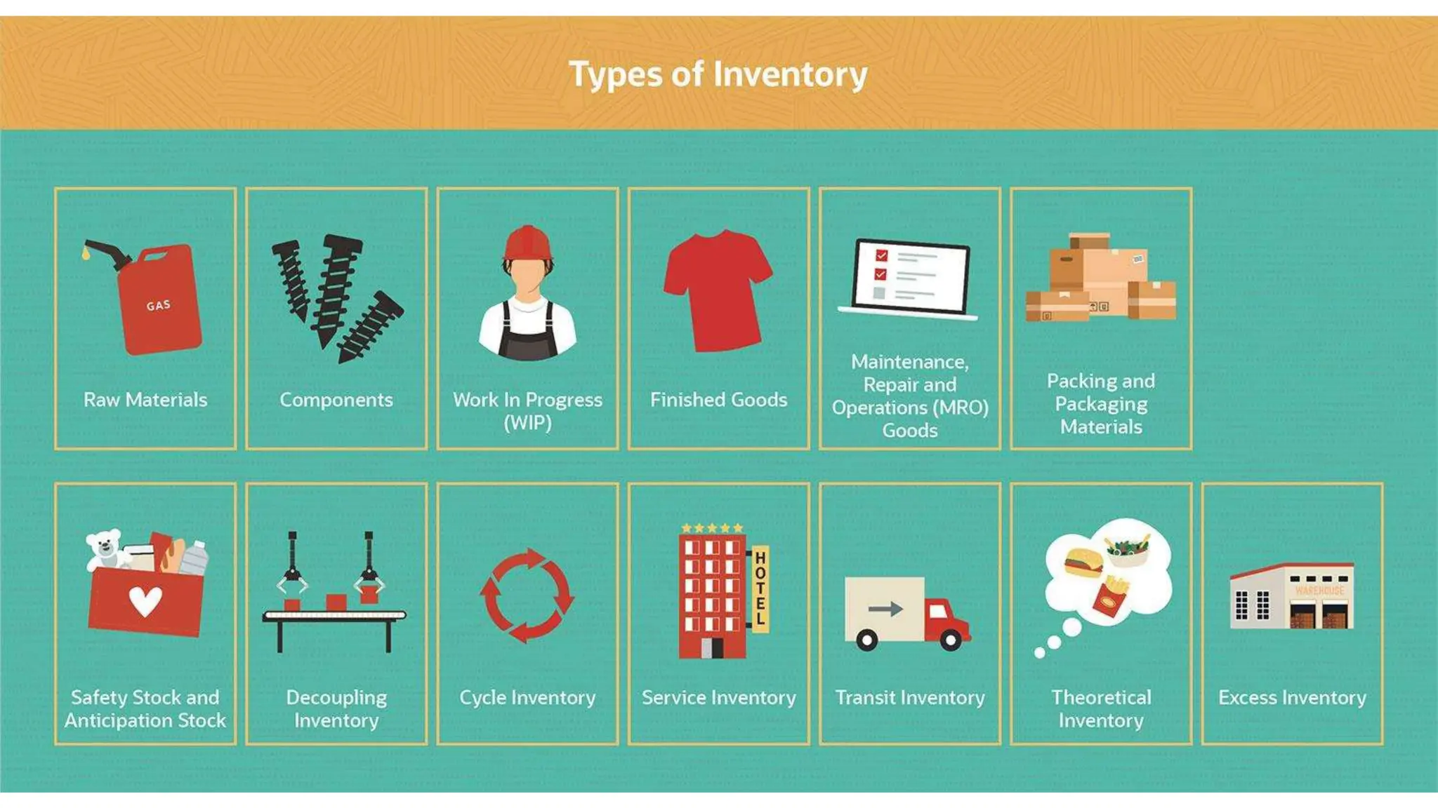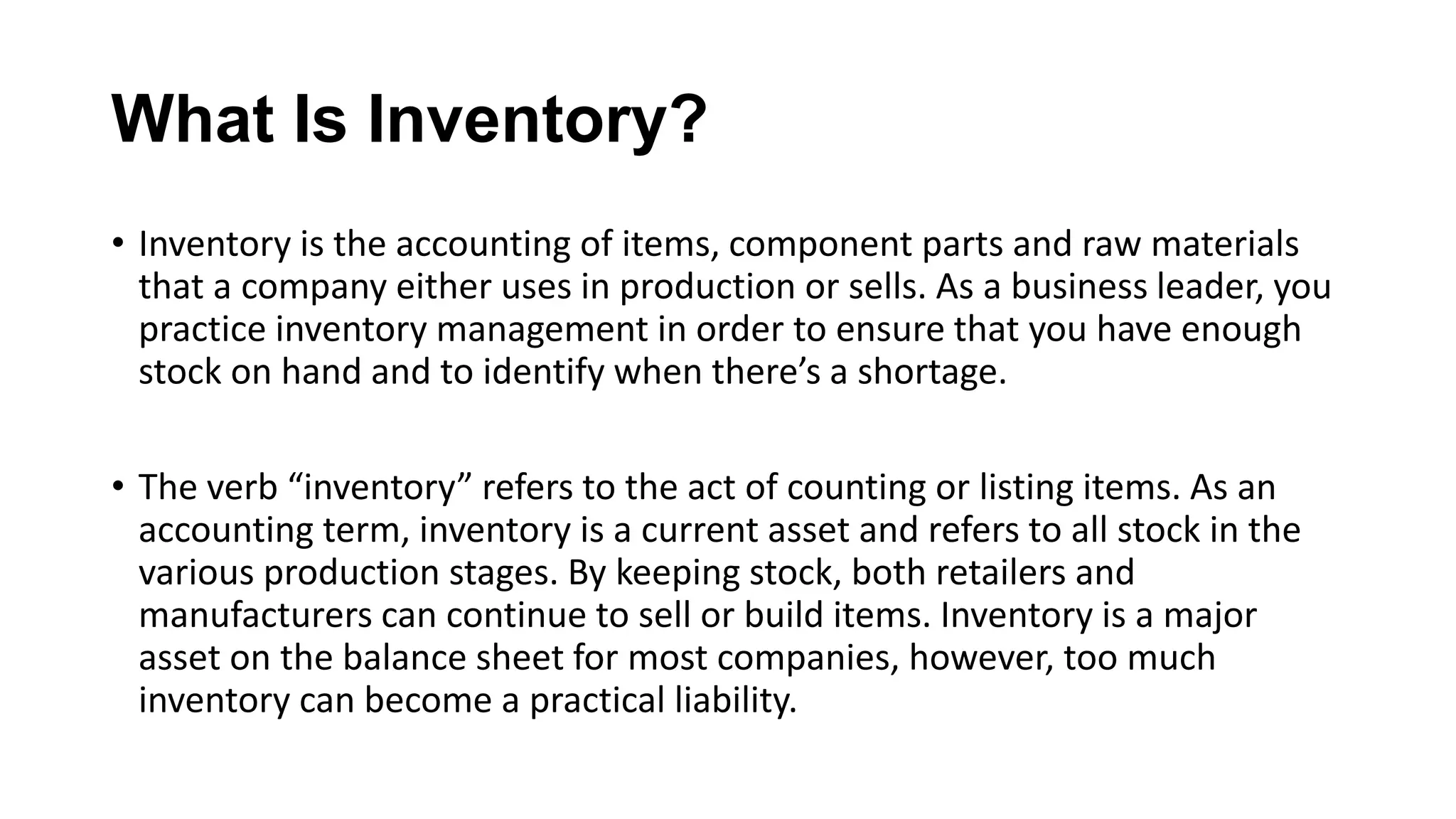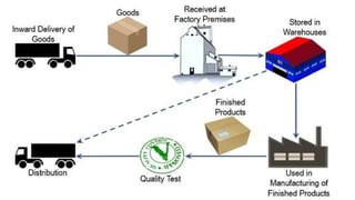This document provides information on inventory and inventory management. It defines inventory as items, parts, and materials that companies use in production or sell. The document then discusses different types of inventory like raw materials, work in progress, finished goods, and safety stock. It explains that inventory management aims to ensure sufficient stock while avoiding excess inventory that can become a liability. The document outlines objectives of inventory management like preventing waste and optimizing costs. It also discusses the importance of inventory management in enabling ERP systems and efficient supply chain management.