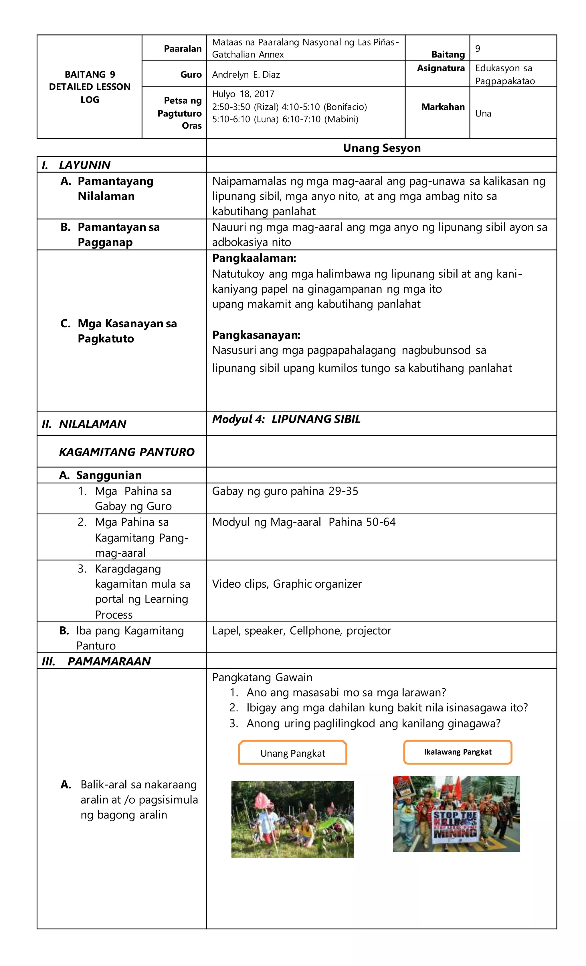 Ang dokumento ay isang detalyadong aralin para sa mga mag-aaral sa baitang 9 sa asignaturang Edukasyon sa Pagpapakatao na tumatalakay sa kalikasan ng lipunang sibil at mga ambag nito sa kabutihang panlahat. Kasama sa mga layunin ng aralin ang pag-unawa sa mga halimbawa ng lipunang sibil at pagsusuri ng mga pagpapahalagang nag-uudyok dito. Ang mga pamamaraan ng pagtuturo ay kinabibilangan ng panonood ng video, grupong talakayan, at pagbibigay ng takdang-aralin.