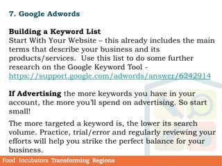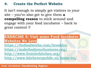 This module discusses strategies for stimulating demand for food incubators. It covers developing an effective brand, communicating your message through marketing, creating a website, using social media, and the power of storytelling. Key points include profiling potential users, translating product features into benefits, developing branding with core values and vision, and telling an impactful brand story. The goal is to attract tenants and users through authentic and consistent communication across multiple channels.