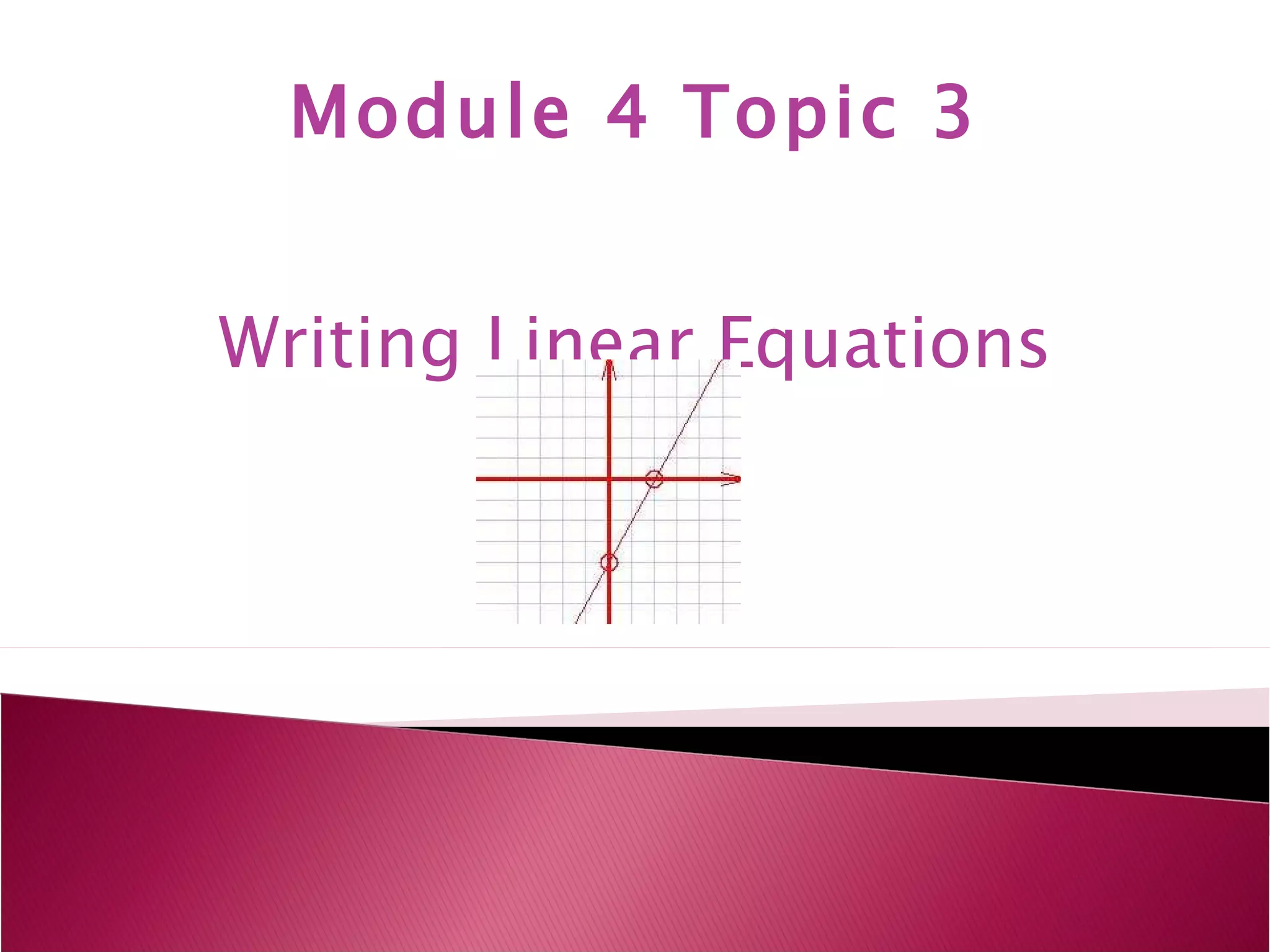This document discusses writing linear equations from different information provided. It explains that the slope-intercept form is y=mx+b, where m is the slope and b is the y-intercept. It also explains that the point-slope form, y-y1=m(x-x1), is used when given a point and the slope. Finally, it notes that when given two points, the slope must first be calculated as m=(y2-y1)/(x2-x1) before using the point-slope form.
