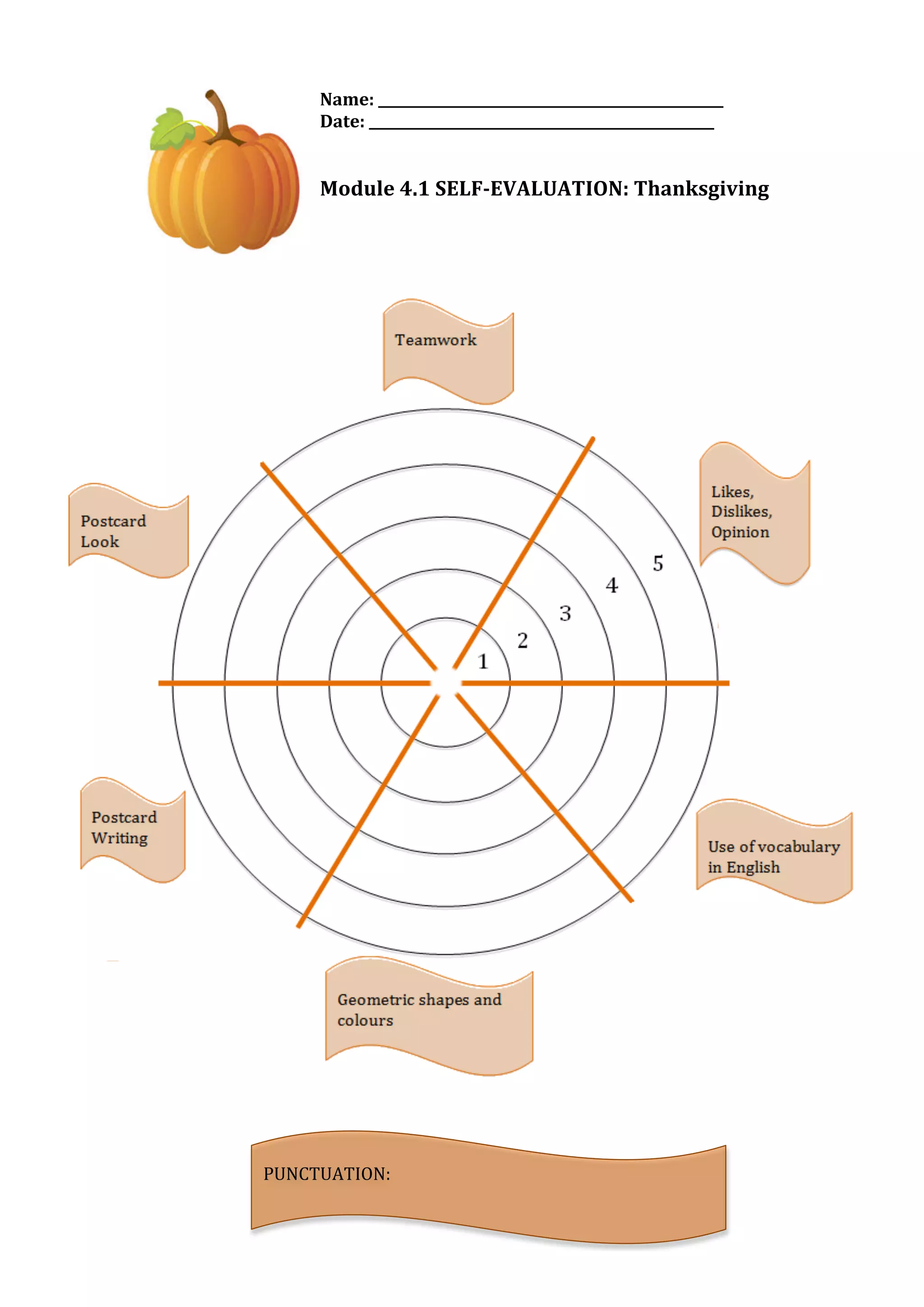 The document contains self-evaluation and peer evaluation forms for students to assess their understanding and performance in a Thanksgiving unit. The self-evaluation form has sections for students to rate themselves on their postcard design, writing, understanding of geometric shapes and colors, vocabulary, and ability to express opinions. For each section, students give themselves a point score and explain how they can improve. The peer evaluation form has a grid for students to rate their classmates on collaboration, respecting ideas, allowing expression of ideas, and active listening.