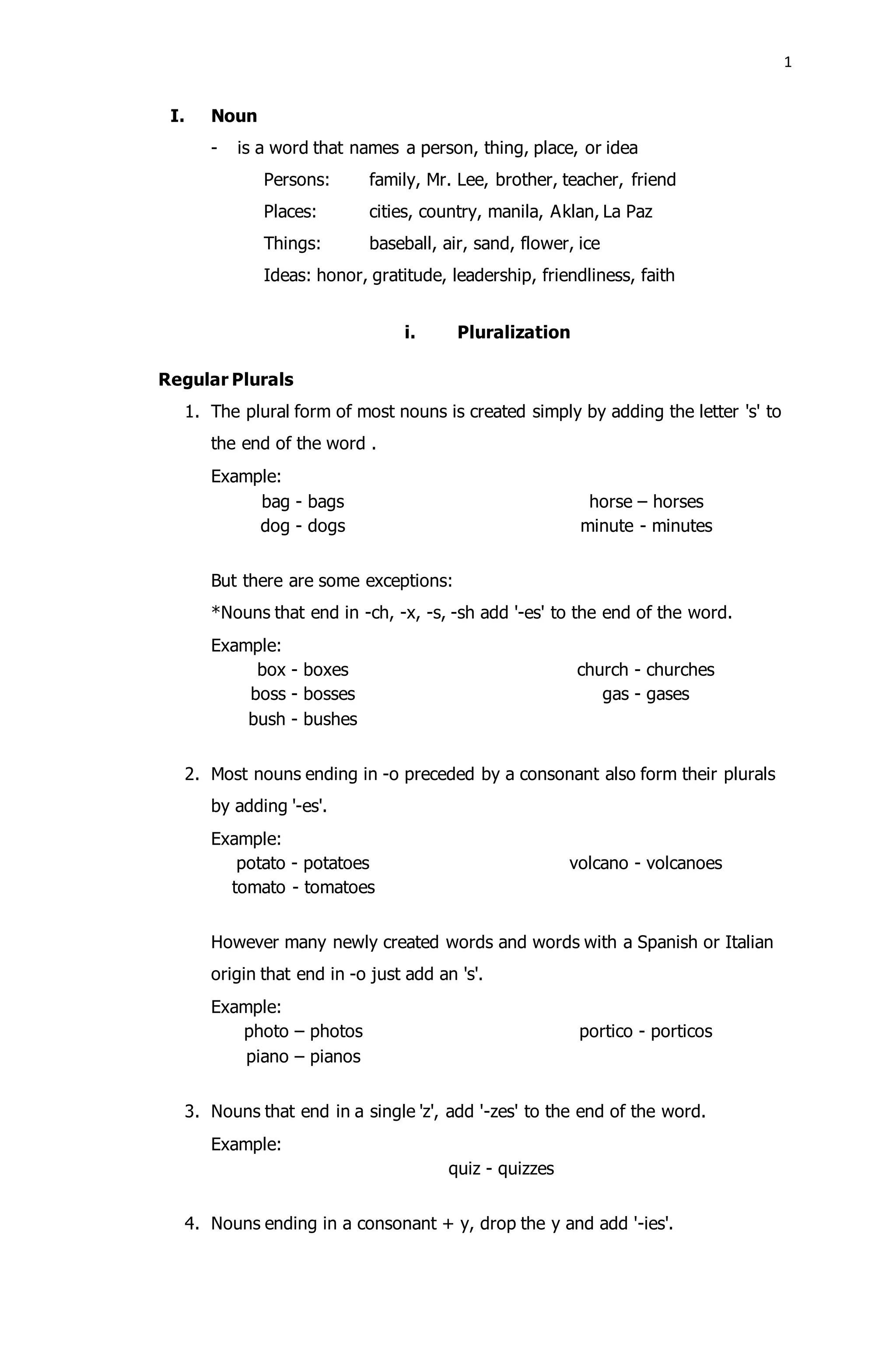 The document discusses nouns and pronouns, including their definitions and different cases. It provides detailed information on pluralization rules for regular and irregular nouns. It also covers possessive forms, capitalization rules for proper nouns, and the three cases of personal pronouns - nominative, objective, and possessive. Key examples are given to illustrate each concept.