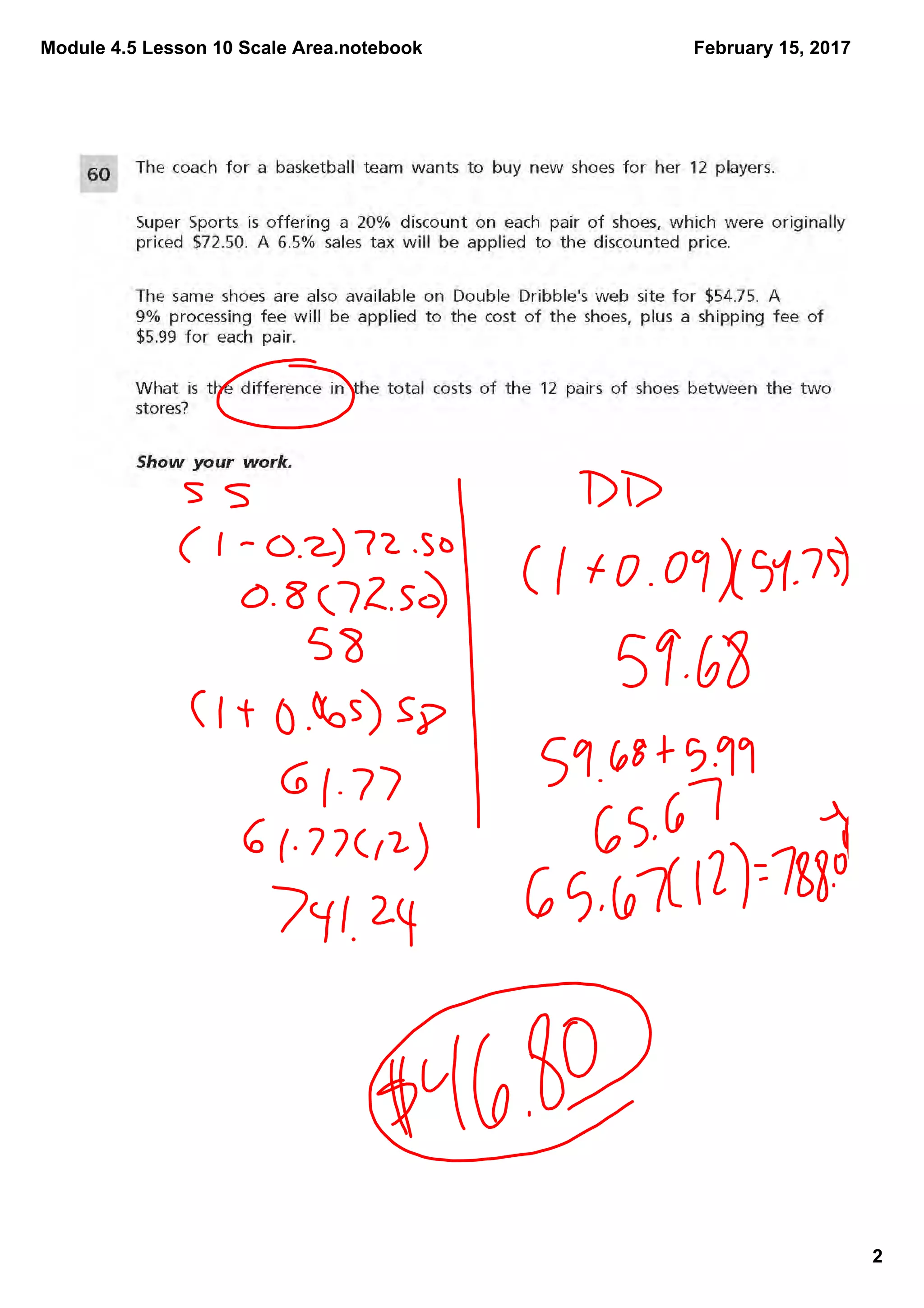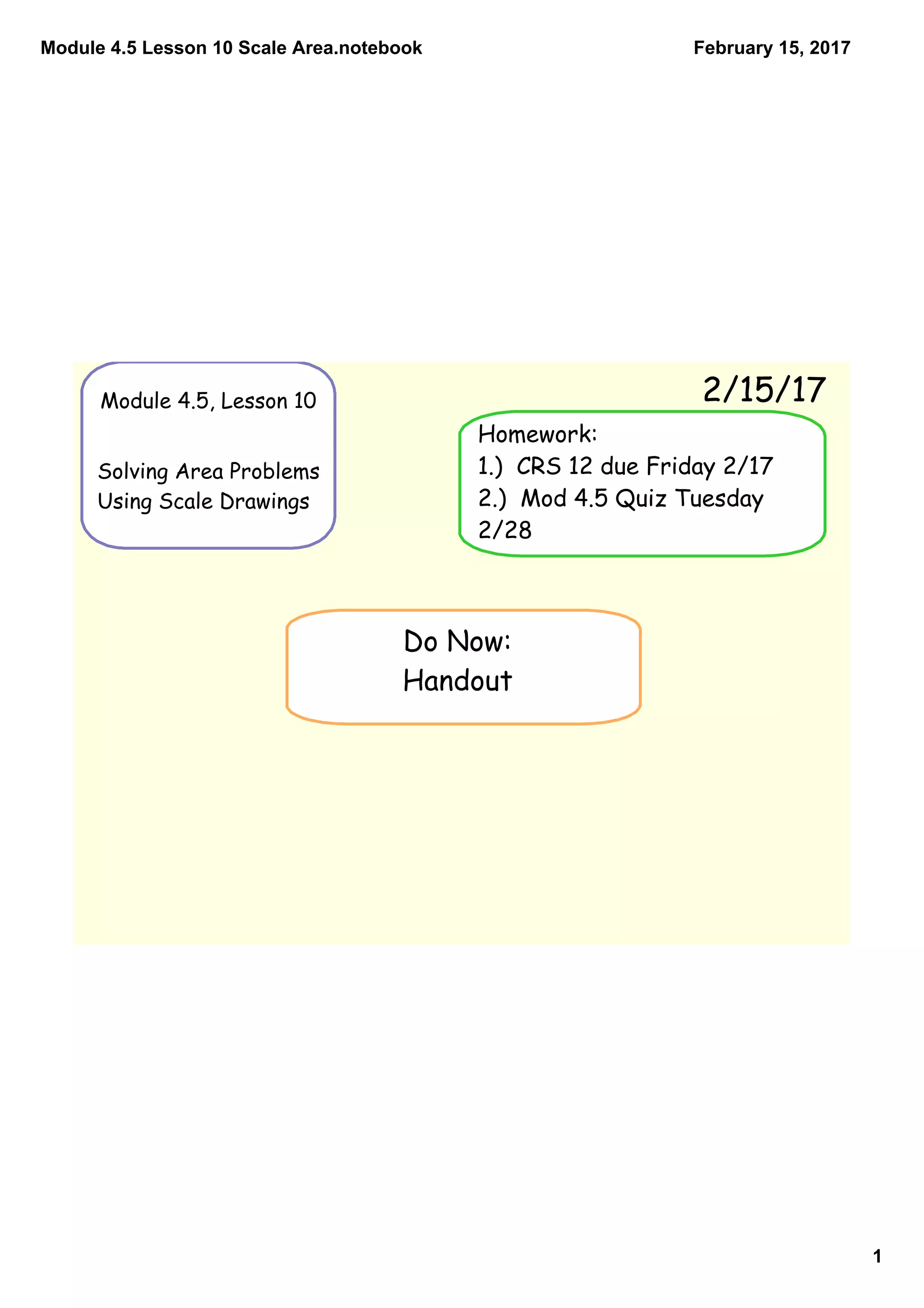 This document contains notes from a math lesson on solving area problems using scale drawings. The lesson outlines the do now activity and upcoming homework assignments. It then discusses scale drawings and scale factors on pages 3 through 11, explaining how to use scale drawings to find the actual area of real-world objects.