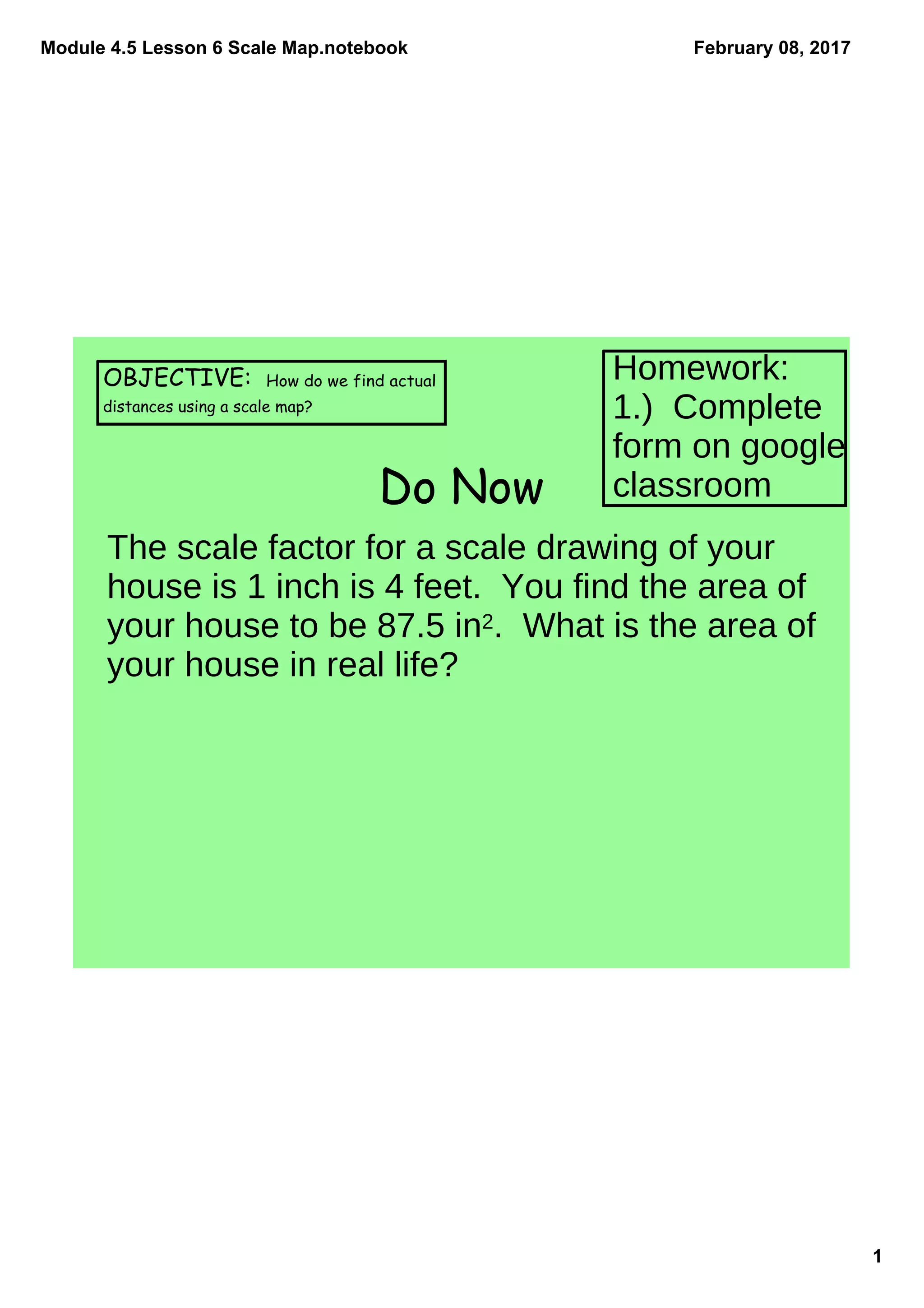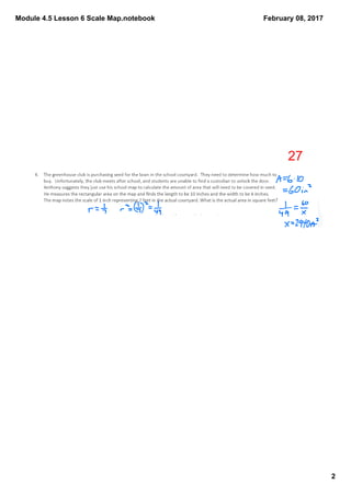 This document discusses using scale maps to determine actual distances. It provides examples of using scale factors and proportions to calculate distances between towns based on their representation on a map. The scale of the map in the examples is 0.75 inches equals 4 miles. Students are asked to use this scale to determine actual distances between various town pairs. They are also asked why distances calculated from a map may be less than the actual distance driven in a car.