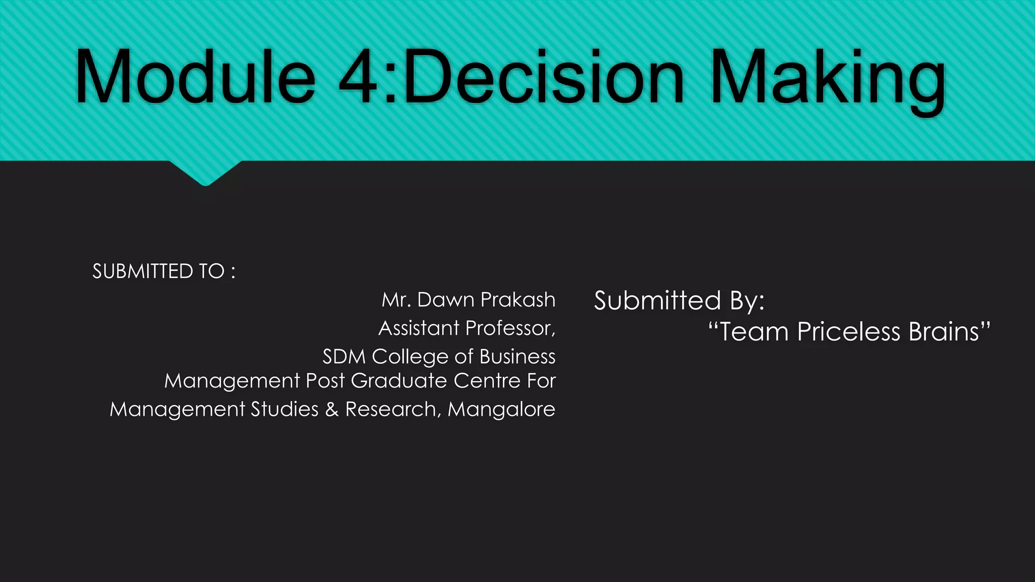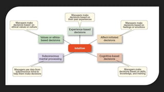 The document summarizes a team presentation on decision making. It discusses the decision making process, approaches to decision making like rational, bounded rationality and intuition-based decision making. It also covers types of decisions, decision making conditions, and decision making approaches like quantitative, systems and environmental approaches. Evidence-based management and its role in decision making is explained. The key aspects of decision making covered are identification of problems, alternatives, analysis, evaluation and implementation.