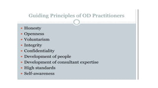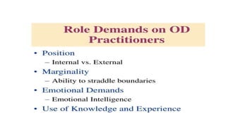 - OD consultants play three roles - entering, contracting, and diagnosing organizations. The entering phase involves building relationships and understanding company culture while contracting establishes formal agreements. Diagnosing requires understanding organizational politics and culture.