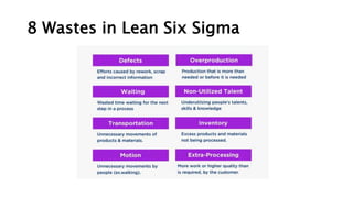 1) The document discusses the eight types of waste in Lean Six Sigma - overproduction, defects, waiting, transportation, unused talent, inventory, motion, and extra processing. Examples are provided for each type.