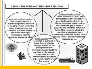 Firefighting systems use various methods to detect and suppress fires. They include sprinklers, hydrants, detectors, and dry or wet risers. Sprinklers have fusible links or frangible bulbs that open at a specific heat to discharge water. Hydrants provide water for hoses. Heat detectors sense rapid temperature increases while smoke detectors use photoelectric or ionizing methods. Dry risers are unpressurized and rely on fire engines while wet risers remain charged with water. Together, these systems aim to quickly detect fires and control water distribution to limit damage.