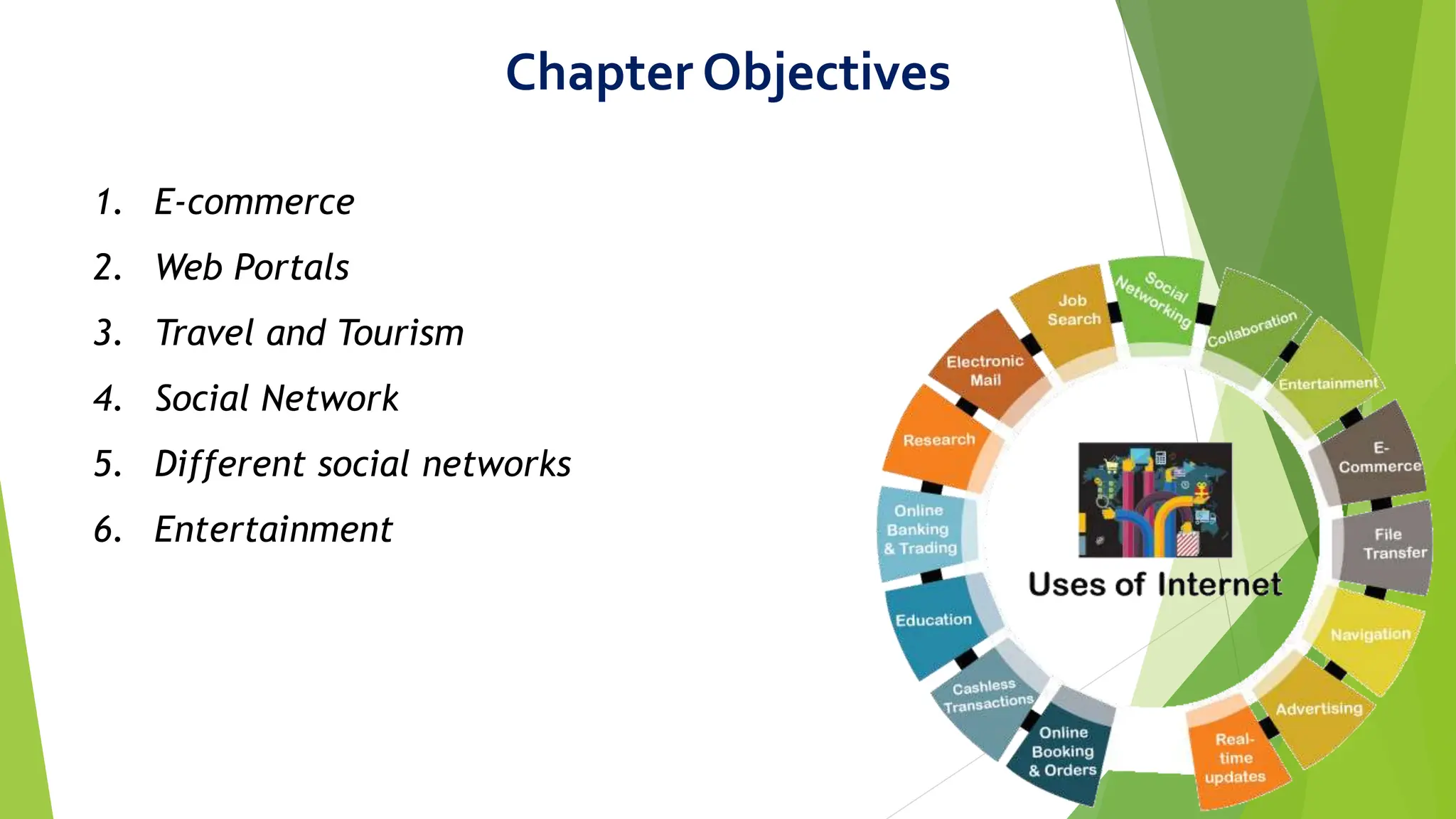 The document discusses various topics related to applications of the internet. It begins by introducing e-commerce and how it has revolutionized business operations. It then discusses how to safely use e-commerce by researching sellers, using secure payment methods, and tracking orders. Next, it introduces web portals as centralized hubs for accessing information and services, and provides tips for securely using portals. It also discusses how travel and tourism websites can help plan trips and highlights steps to safely use these sites. Finally, it introduces different social networks and how they enable online connections, before concluding with the role of digital literacy in the entertainment sector.