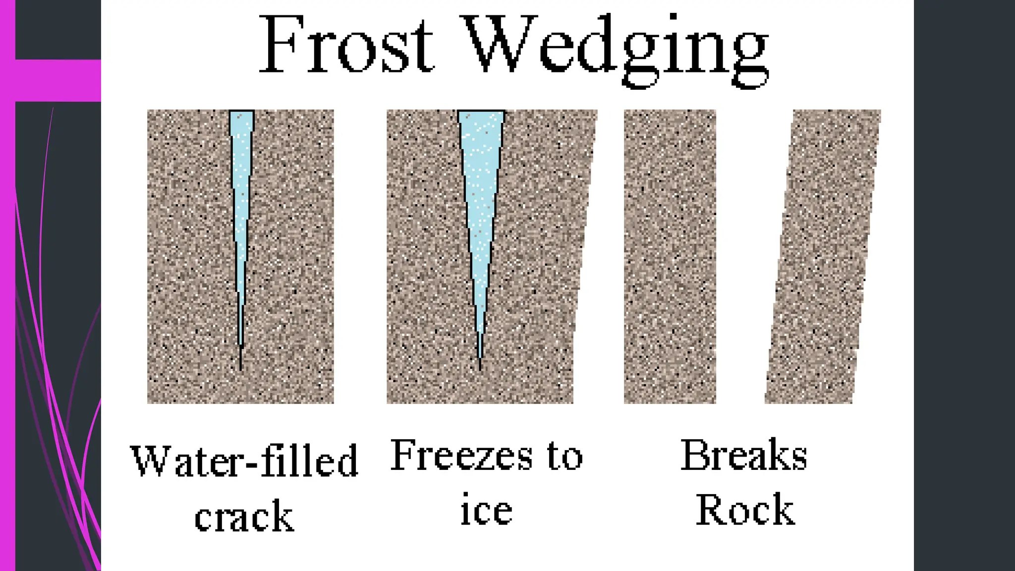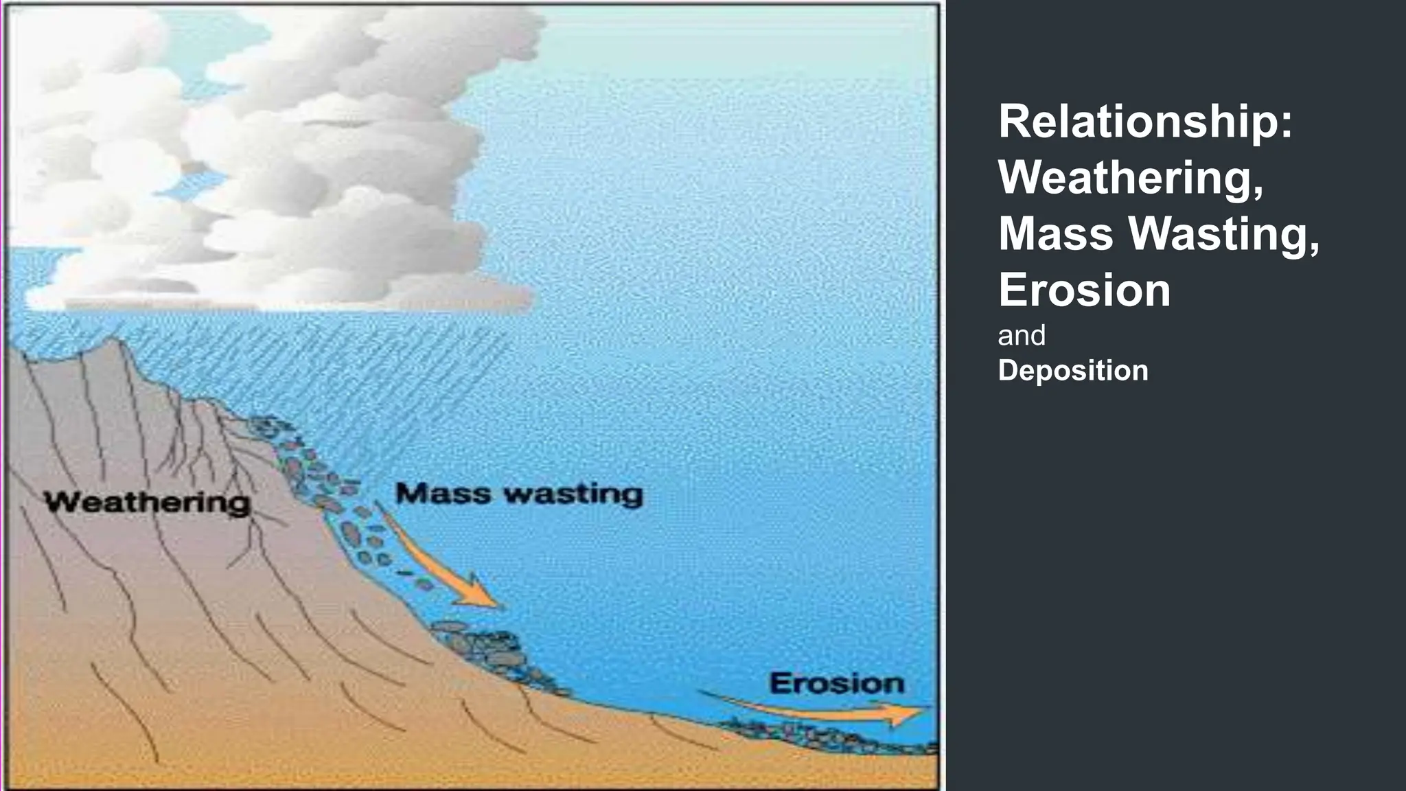 The document explains how rocks break down through weathering, erosion, and deposition, categorizing weathering into mechanical and chemical types. Key processes include mechanical actions like frost wedging and biological weathering, as well as chemical changes caused by hydrolysis and oxidation. Erosion involves the transportation of weathered materials, influenced by natural agents, while mass wasting describes the downslope movement of sediments due to gravity.