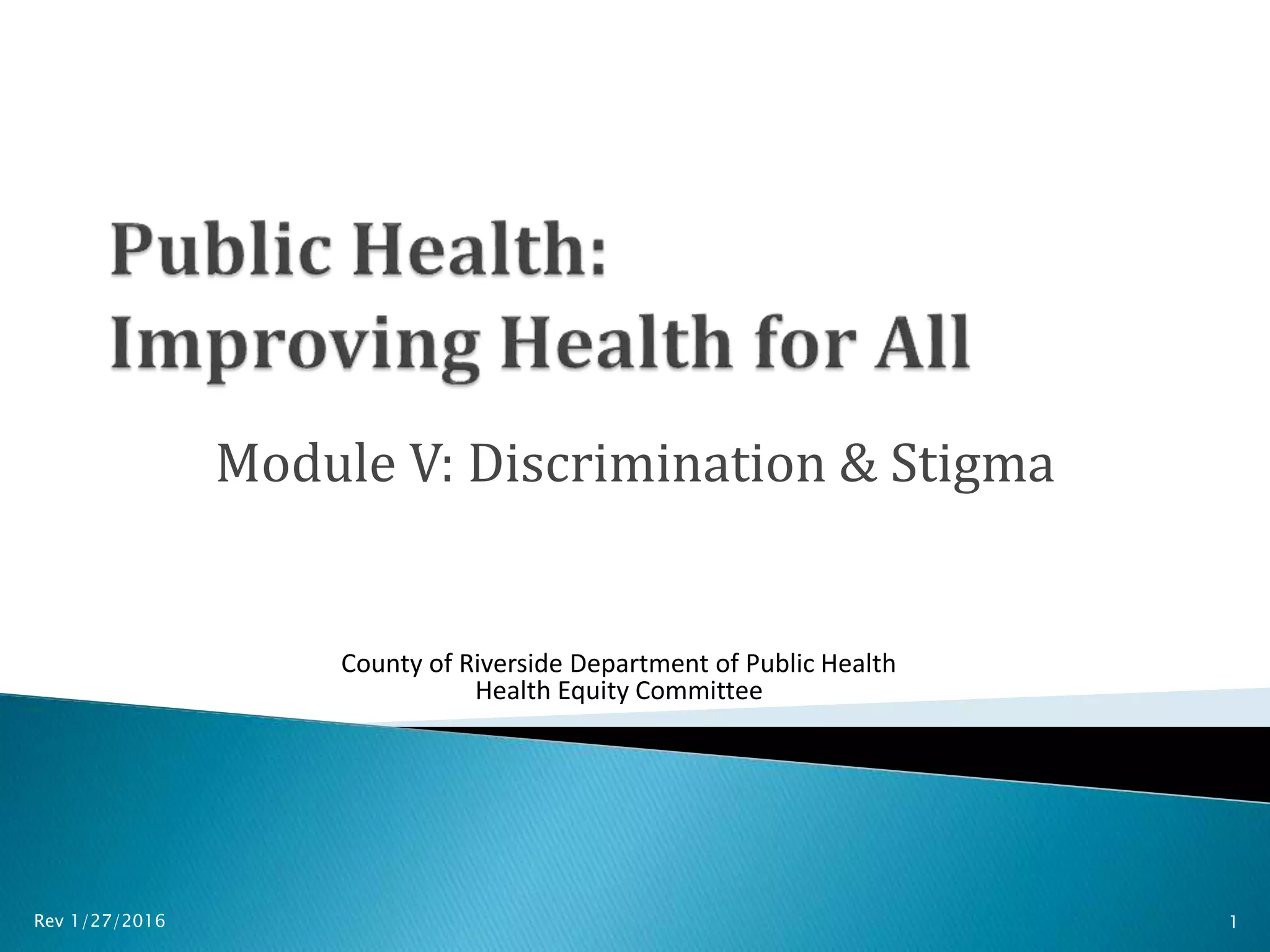 This document provides an agenda and materials for a training session on discrimination and stigma. The training will discuss perceived discrimination and stigma among LGBT, aging, and disabled populations. Participants will learn to recognize and address discrimination among these groups and discuss how to avoid and undo discrimination. An activity is planned where participants receive labels and interact to experience being treated in a stereotyped way. The goals are for participants to understand the health impacts of stigma and how public health can work to promote inclusion and well-being for all.