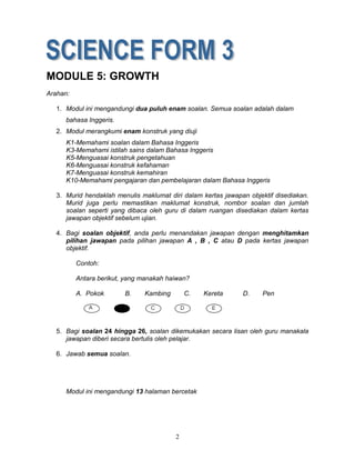 The document is a science module on human growth in the Malay language administered by the Malaysian Ministry of Education. It contains instructions for students on how to complete the multiple choice exam, followed by 26 multiple choice questions testing students' understanding of concepts related to the stages of human growth such as infancy, childhood, adolescence, and old age. The questions cover topics like the growth curve, puberty, factors that affect growth, and using growth data to draw conclusions.
