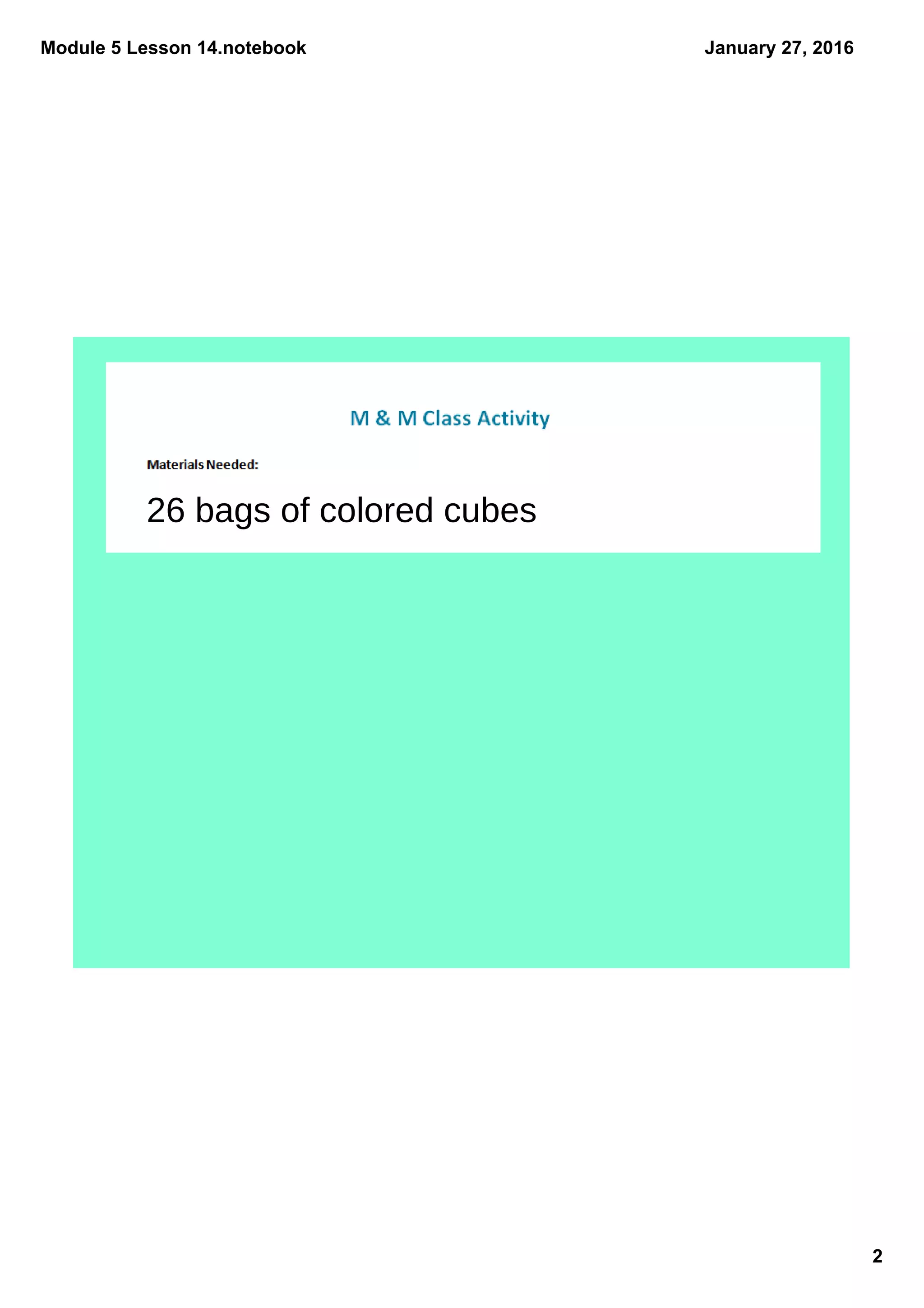 The document outlines the plans for a math lesson on January 27th, 2016. It notes that the homework is to complete problems sets 2 and 4 from Lesson 14. The in-class activity will involve 26 bags of colored cubes. There will be an exam on this material on Friday, January 29th.