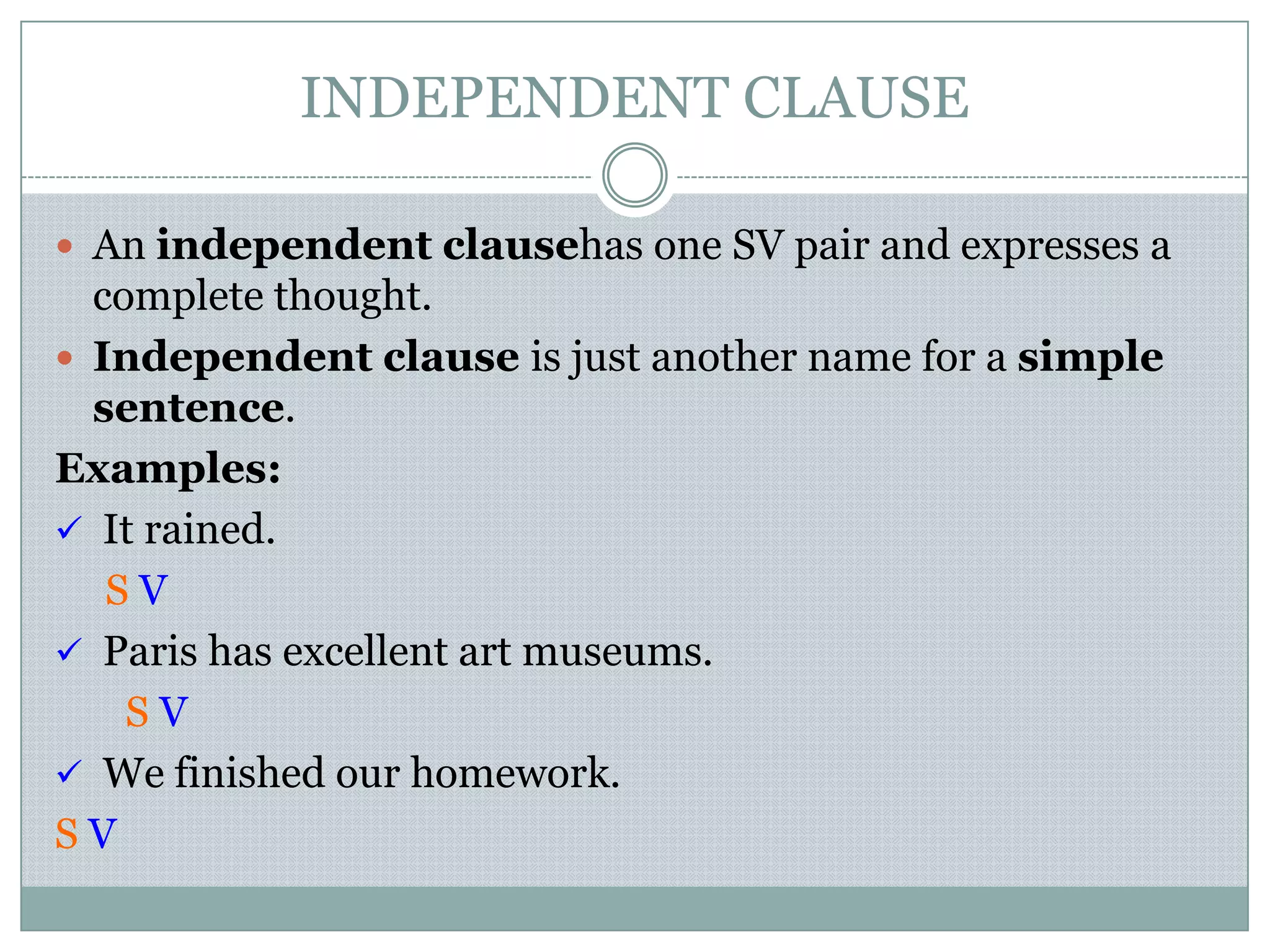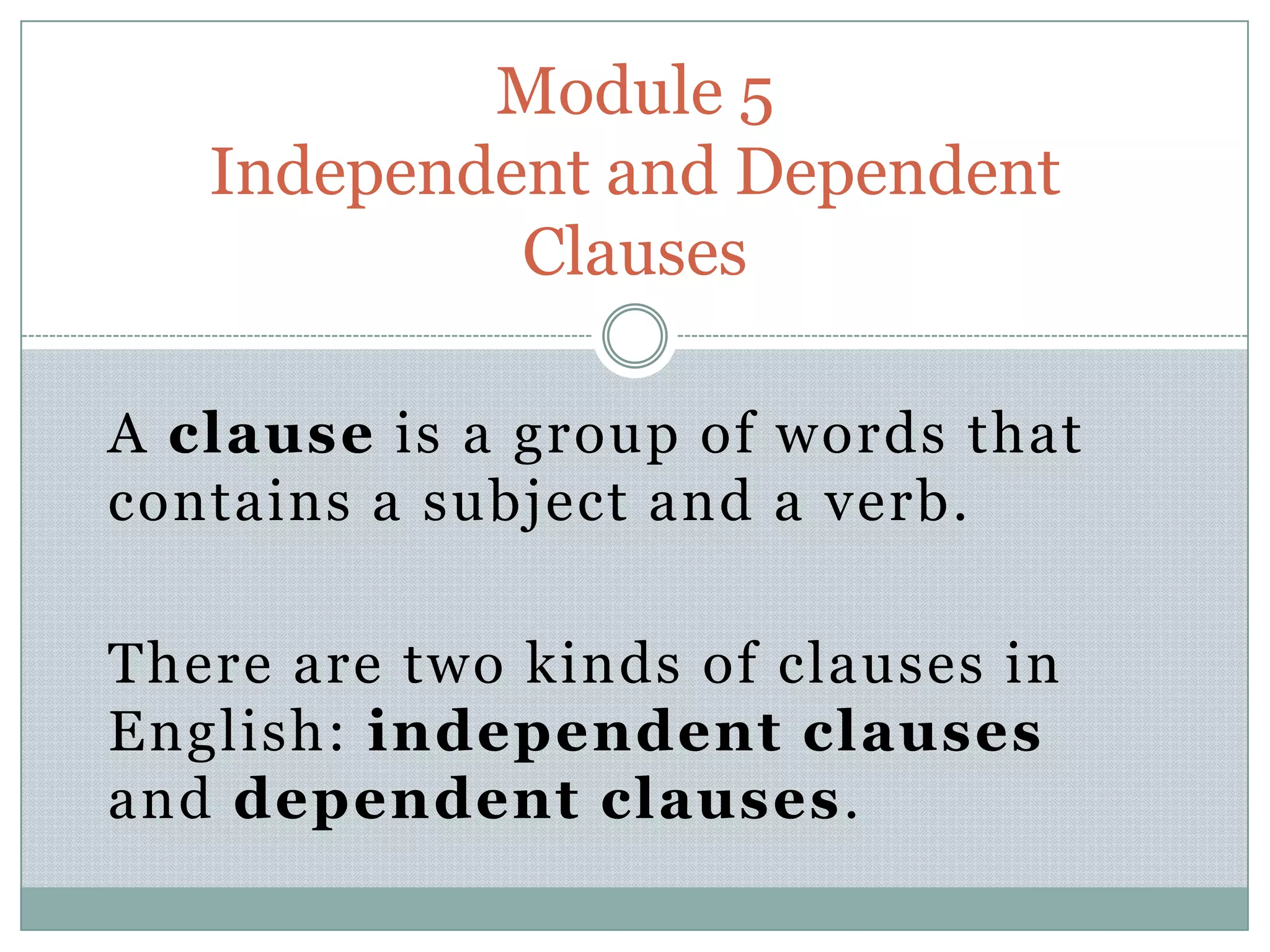 This document discusses independent and dependent clauses. It defines an independent clause as having one subject-verb pair and expressing a complete thought, essentially being another name for a simple sentence. A dependent clause is defined as an independent clause with a subordinating word like "because" or "when" added to the beginning, making it unable to stand alone as a complete thought and requiring it to be joined to an independent clause. Several examples of independent and dependent clauses are provided. The document also discusses subordinating conjunctions that can introduce dependent clauses and lists some common time-related subordinating conjunctions like "after", "before", and "when".