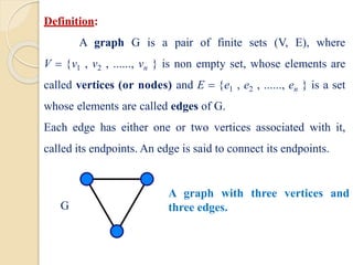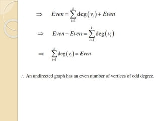 This document serves as an introduction to graph theory, defining key concepts such as vertices, edges, types of graphs (directed, undirected), and various terminologies related to graph structures. It discusses properties of vertices, including degree, in-degree, and out-degree, and elaborates on specific types of graphs like regular, complete, bipartite, and weighted graphs. Additionally, it presents the handshaking theorem, which highlights relationships between vertex degrees and edges, as well as solving example problems related to these concepts.