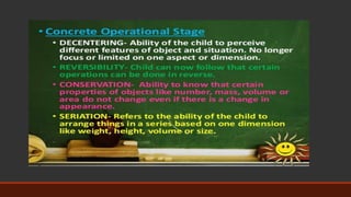 Jean Piaget conducted research on cognitive development over sixty years. He observed individuals completing cognitive tasks to understand how knowledge develops. Piaget's theory includes four stages of cognitive development: sensorimotor, preoperational, concrete operational, and formal operational. His theory focuses on concepts like schemas, assimilation, accommodation, and equilibration and how children's thinking changes as they progress through the stages. Piaget's theory has been widely applied to teaching and curriculum design, especially for preschool and elementary students.