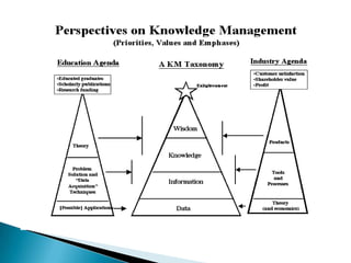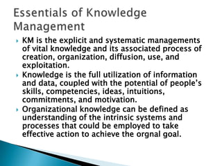 The document discusses knowledge management (KM) and organizational knowledge. It defines KM as the explicit and systematic management of vital knowledge and associated processes. Organizational knowledge is understanding systems and processes to achieve organizational goals. Effective KM architectures make knowledge available, accurate to retrieve, effective, and accessible when needed. Creating a knowledge-sharing culture and leveraging technologies can help internal knowledge become available.