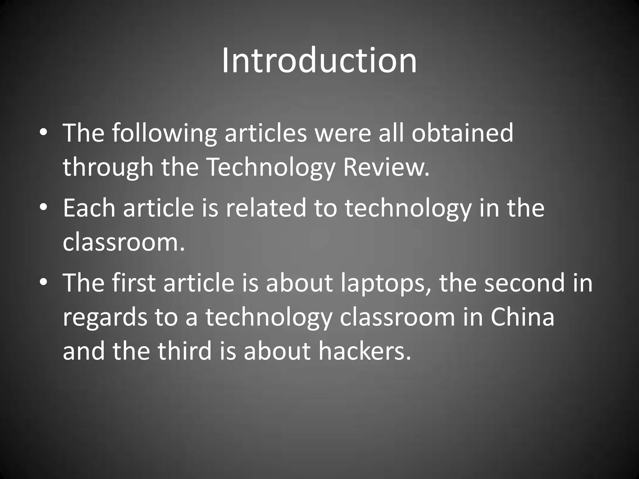 The document discusses three articles from Technology Review about technology in education. The first article discusses a plan for Michigan to provide 6th grade students with laptops for school and home use, though some educators are skeptical it will solve classroom problems alone. The second article describes an experimental classroom in China where the teacher instructs students remotely by broadcasting lessons and calling on virtual students. The third article argues schools should teach basic hacking principles to help students avoid becoming victims of hacking or identity theft, such as how to identify Trojans and protect web privacy.