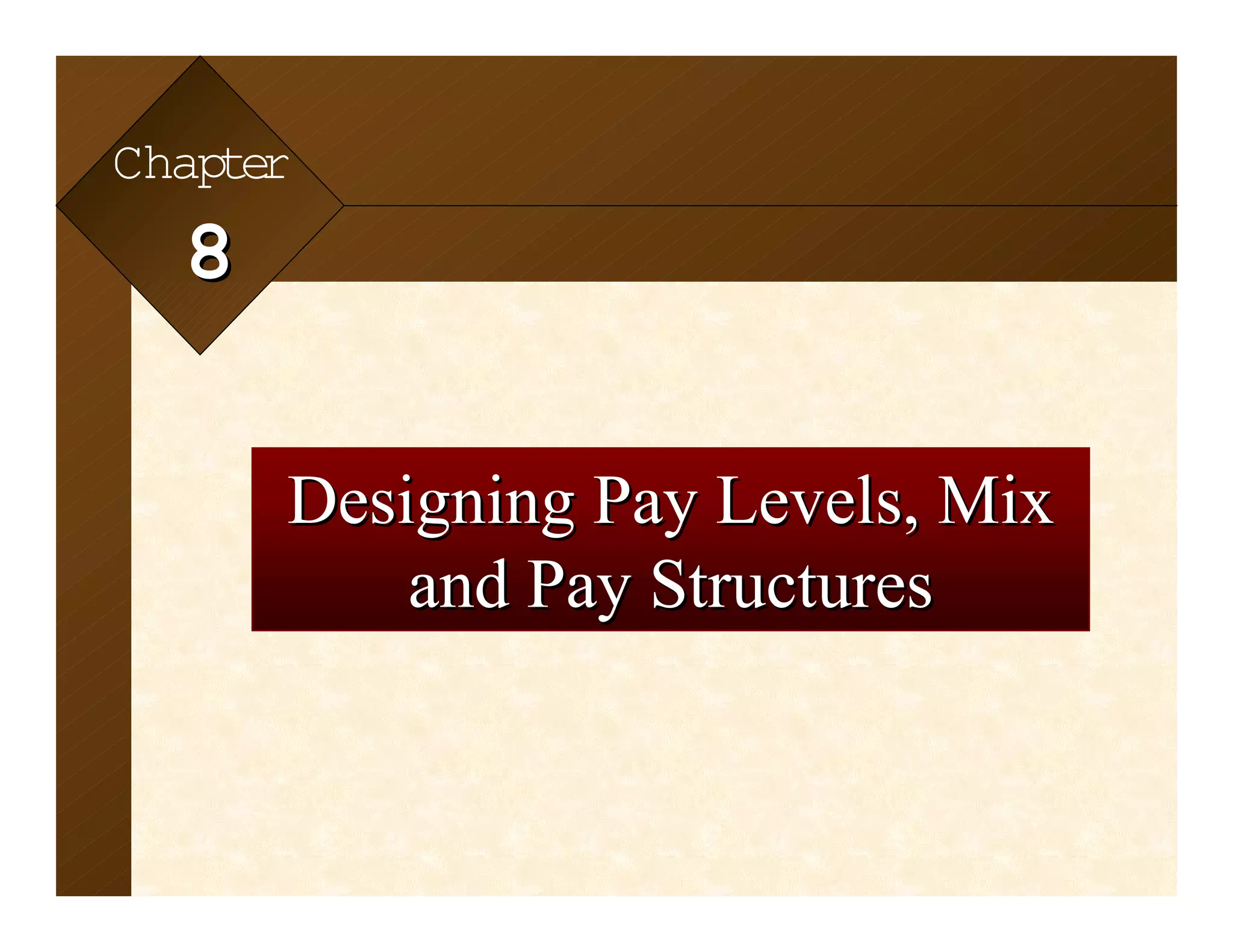 The document discusses designing pay levels, structures, and surveys. It covers determining competitive pay levels and structures through defining relevant labor markets, designing and conducting salary surveys, analyzing survey data, and setting pay policies. The goal is to collect compensation data from competitors to determine appropriate pay levels and structures for matching jobs internally and staying competitive externally.