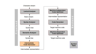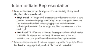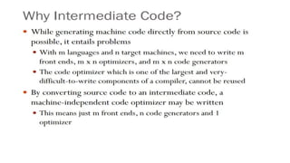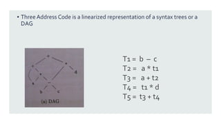 The document discusses the significance of intermediate code in programming, particularly focusing on three address code. It provides various examples of three address code generation for assignments, conditional statements, and arithmetic expressions, along with explanations of quadruples and triples representations. Additionally, it outlines the advantages and disadvantages of using quadruples and triples for organizing intermediate code.