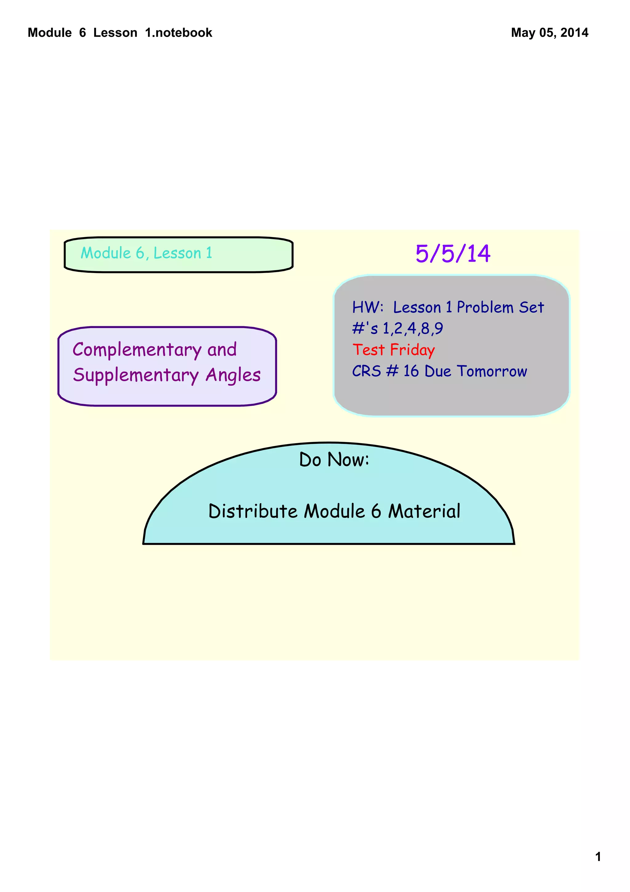 This document contains notes from a math lesson on complementary and supplementary angles. It includes definitions of complementary and supplementary angles, notes on creating tape diagrams, and assignments for homework problems and a test on Friday.
