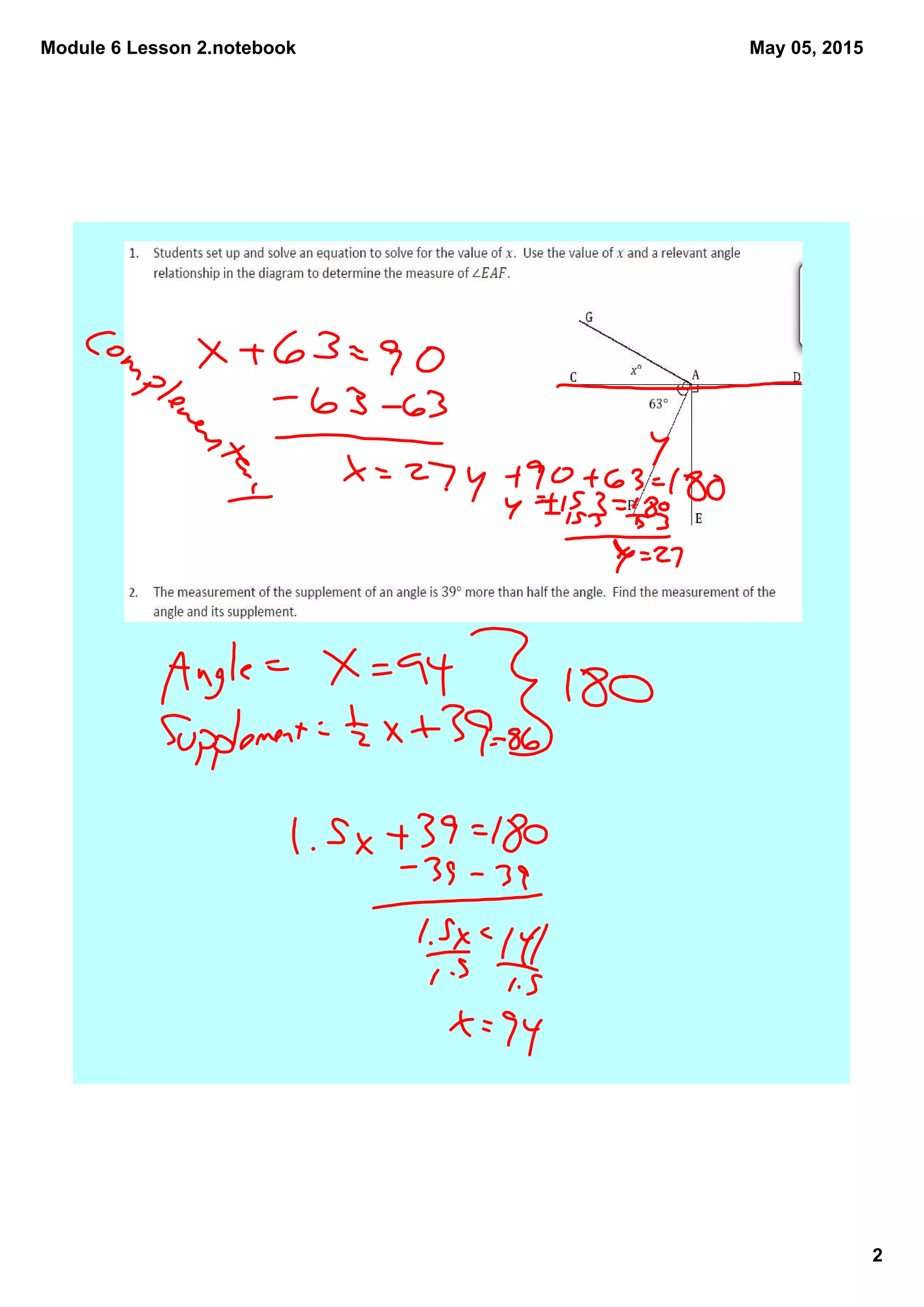 The document outlines the lesson plan for Module 6 Lesson 2, which teaches solving for unknown angles using equations. It lists the homework assignments as problems 1-3 and 7-10 from Problem Set 2. It then provides the answers to homework problems 6-10 from previous lessons to help students check their work. The lesson aims to teach solving for unknown angles using equations and includes an exit ticket and do now activity.