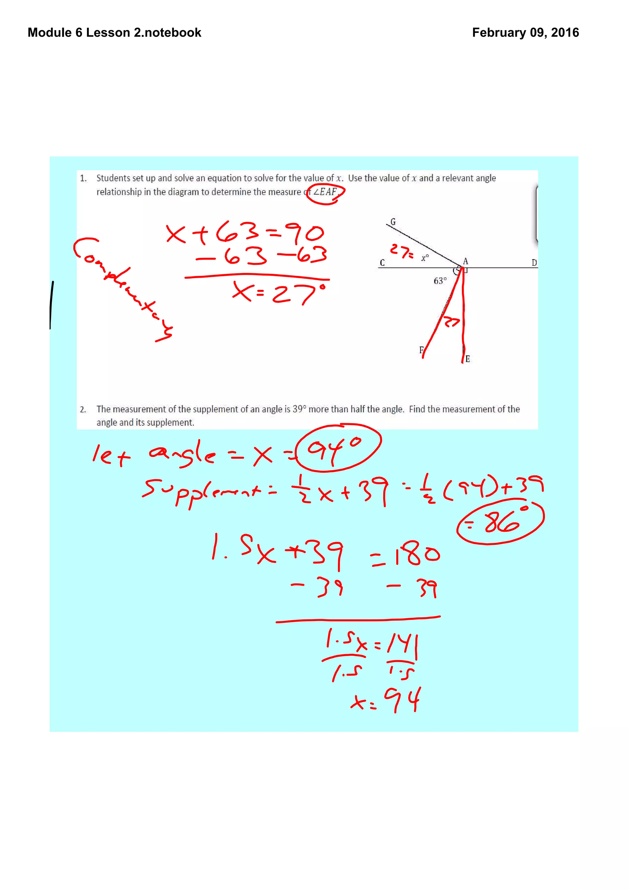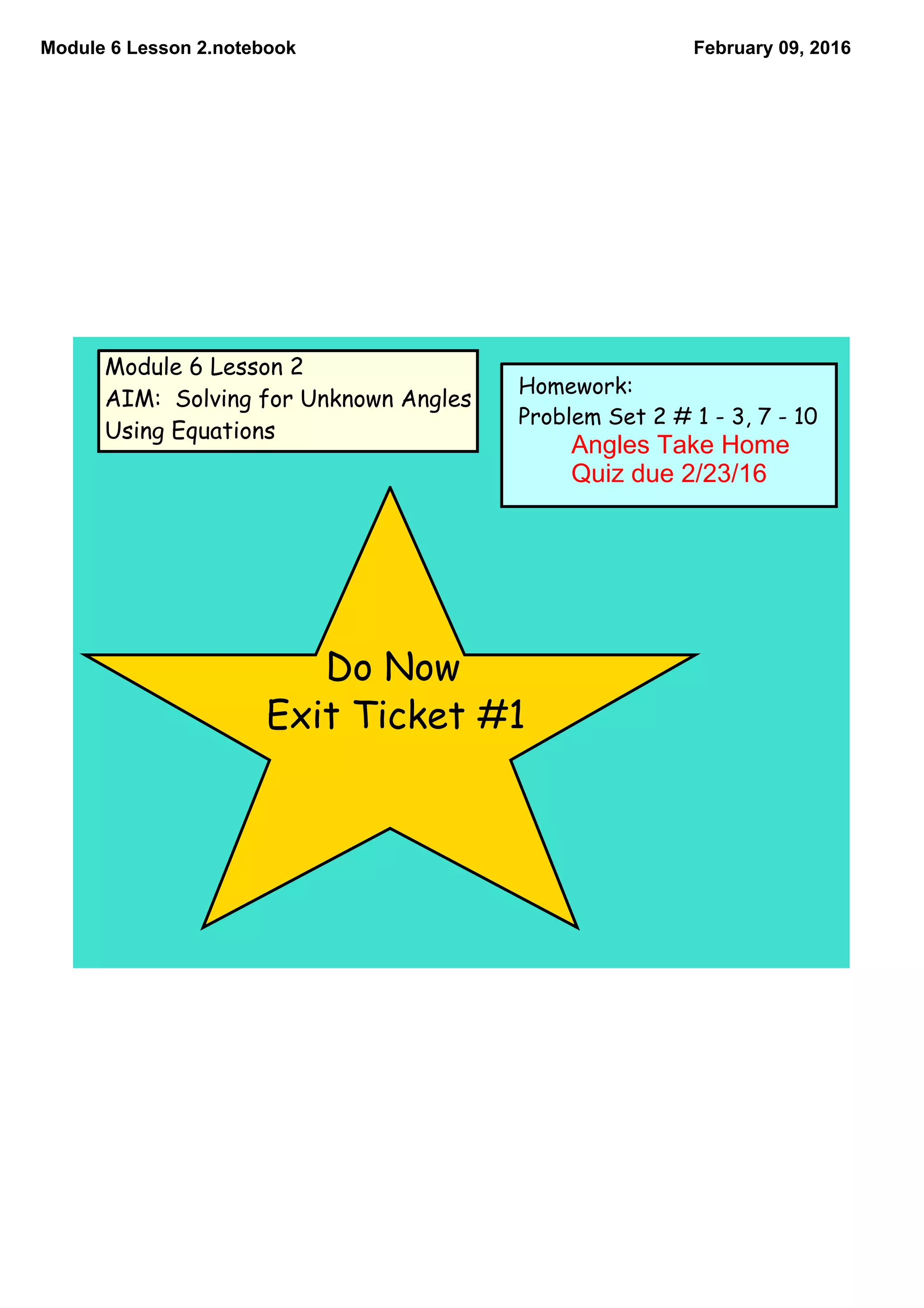 The document outlines the agenda and homework for a math lesson on solving for unknown angles using equations. It includes the aim of the lesson, homework problems to complete from Problem Set 2, an exit ticket, and notes on checking answers. A quiz on the material is due on February 23rd.