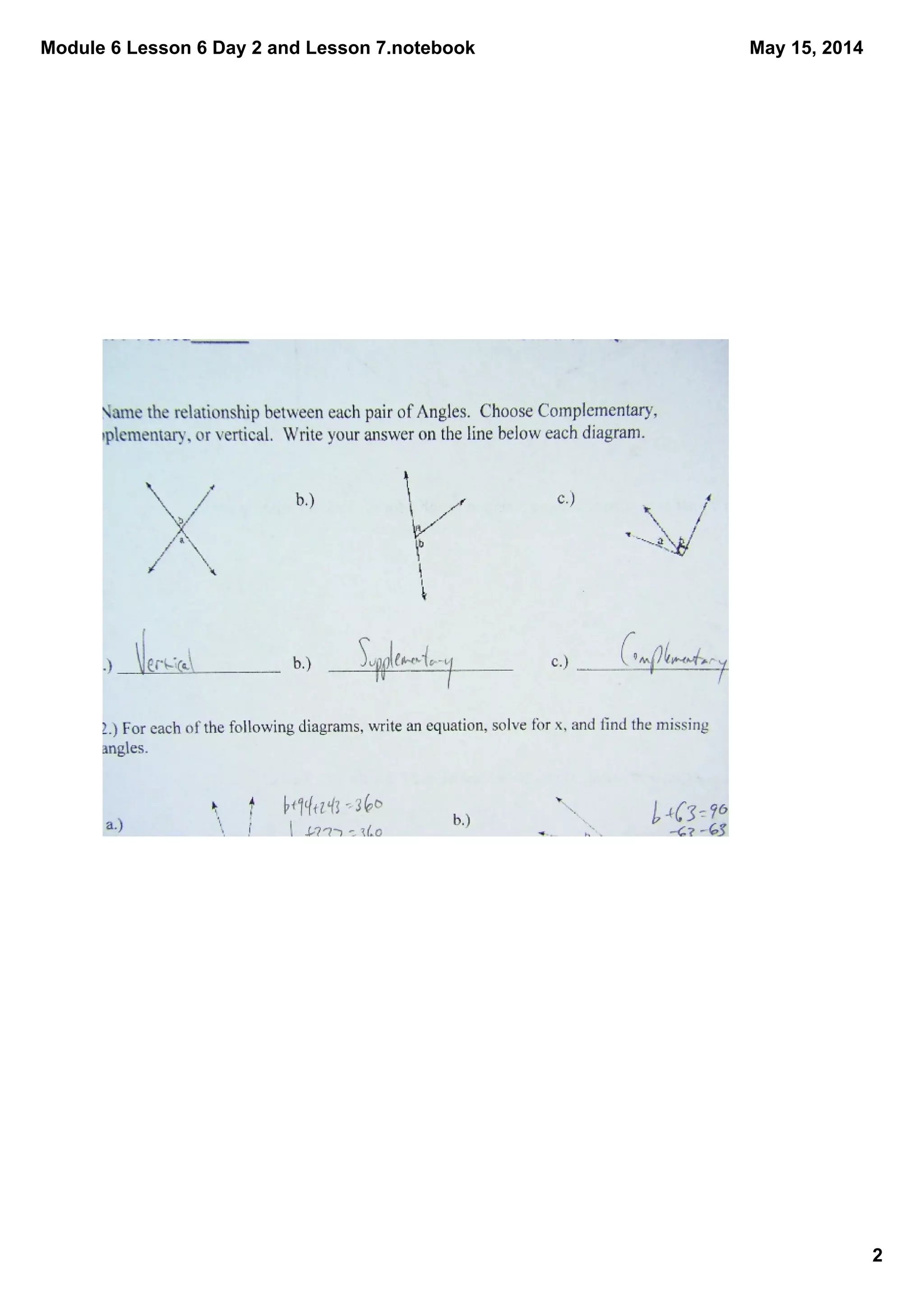 The document outlines lessons for Module 6 on geometric constructions. It includes instructions for students to prepare for an angles quiz, discuss homework with partners, and complete practice problems on geometric constructions and angles. Pages contain notes from lessons on constructing angles and completing practice problem sets.