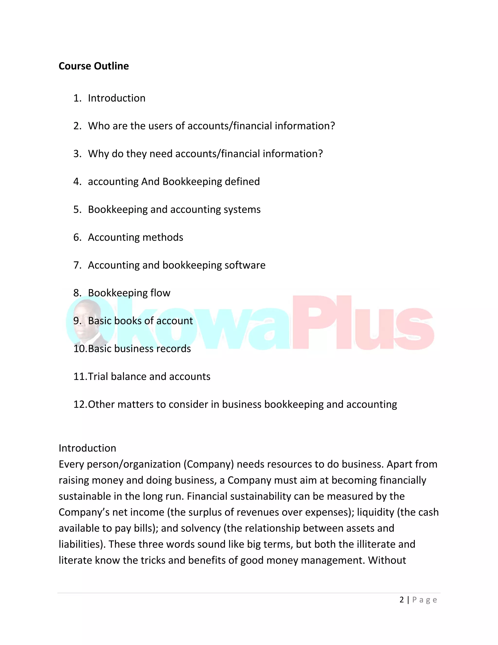 This document provides an introduction to basic bookkeeping and accounting concepts for businesses. It defines key terms like bookkeeping, accounting, cash basis and accrual basis accounting. It explains that bookkeeping is the process of recording financial transactions, while accounting analyzes and reports on this financial information. The document outlines the different users of accounting information, both internal and external to a business, and why they need this financial data. It also describes the different bookkeeping systems a business may use, including single-entry and double-entry systems.