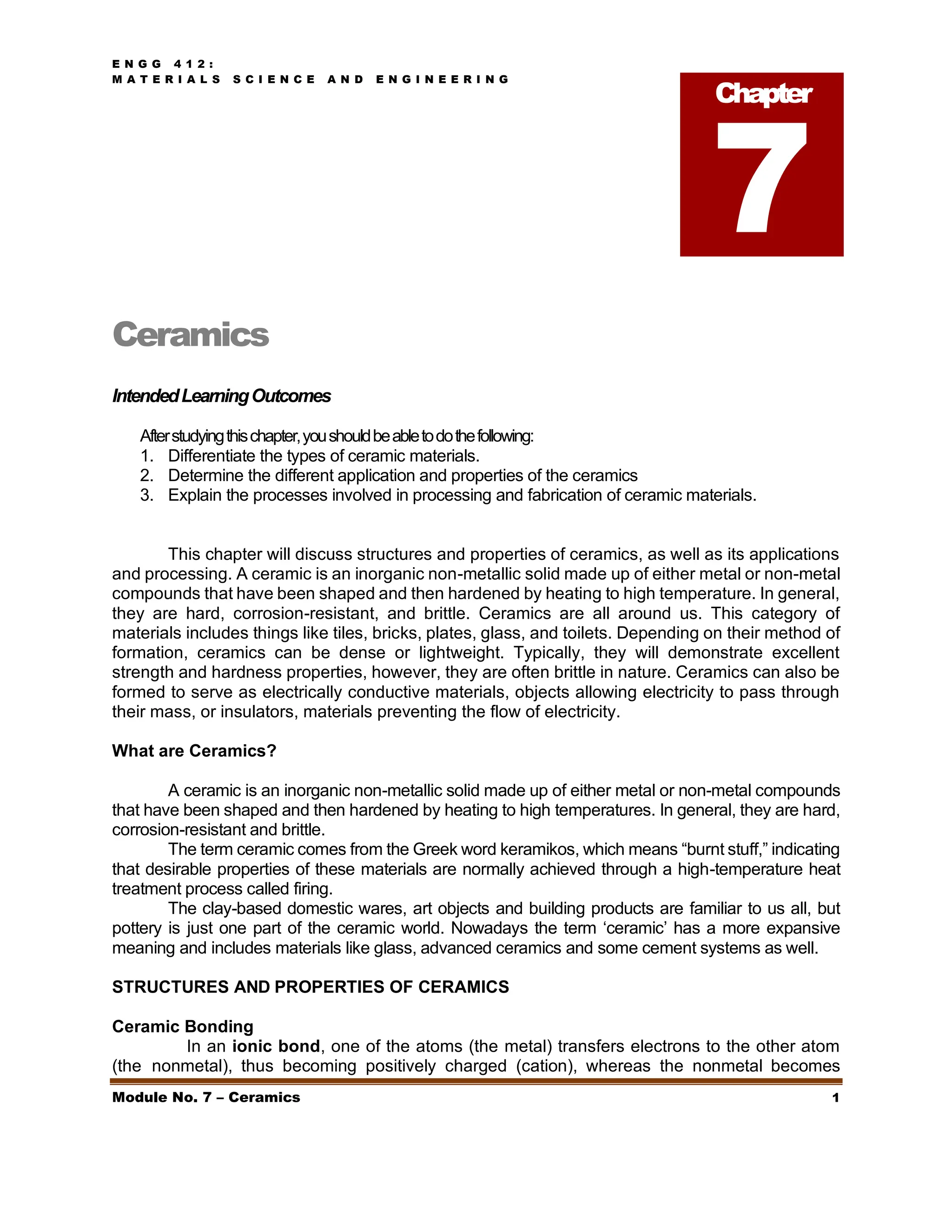 This document discusses ceramics, including their structures, properties, classifications, and applications. Ceramics are inorganic materials made by shaping and hardening compounds with heat. They are hard, corrosion-resistant, and brittle. Ceramics form ionic or covalent bonds and various crystal structures that give them useful properties but also brittleness. Major ceramic classes include glasses, clay products, refractories, advanced ceramics, and more. Each has distinct compositions and applications like containers, bricks, furnace linings.