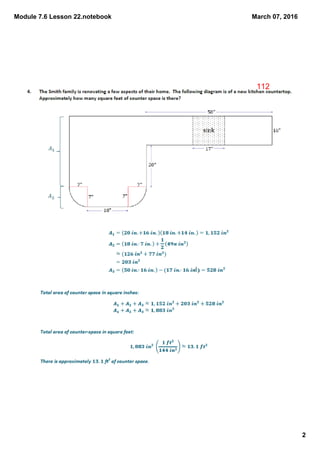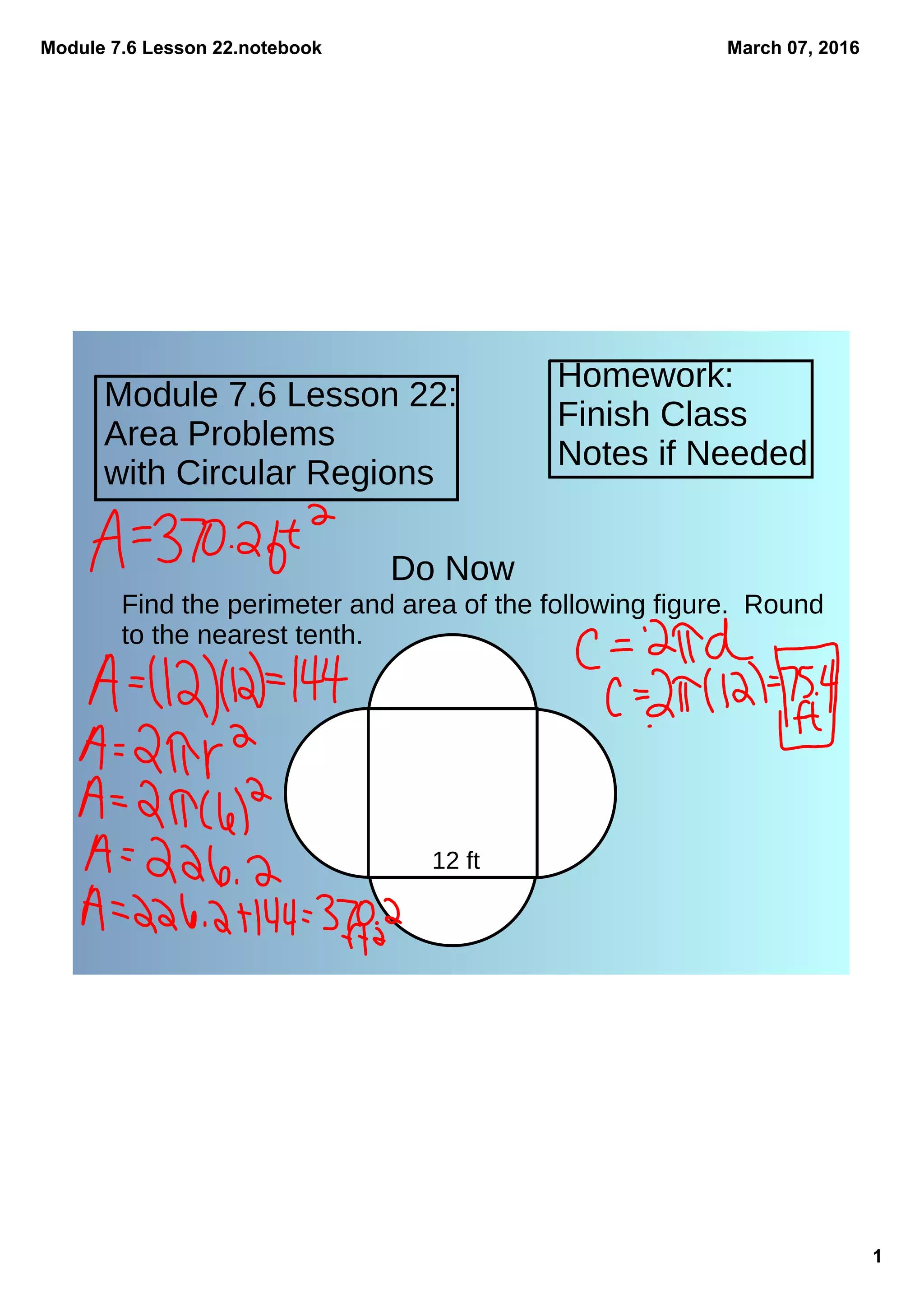 This document contains notes from a math lesson on finding the area of circular regions. It includes examples of calculating the perimeter and area of a circle with a radius of 6 feet. The notes demonstrate how to use a pi button to calculate the area of circles to varying degrees of precision, and pose the closing question of how to find the area of parts of circles.