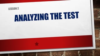1. This module discusses guidelines for assembling, administering, analyzing, and improving tests. It covers properly packaging test items, reproducing the test, administering the test to reduce anxiety, and scoring procedures.