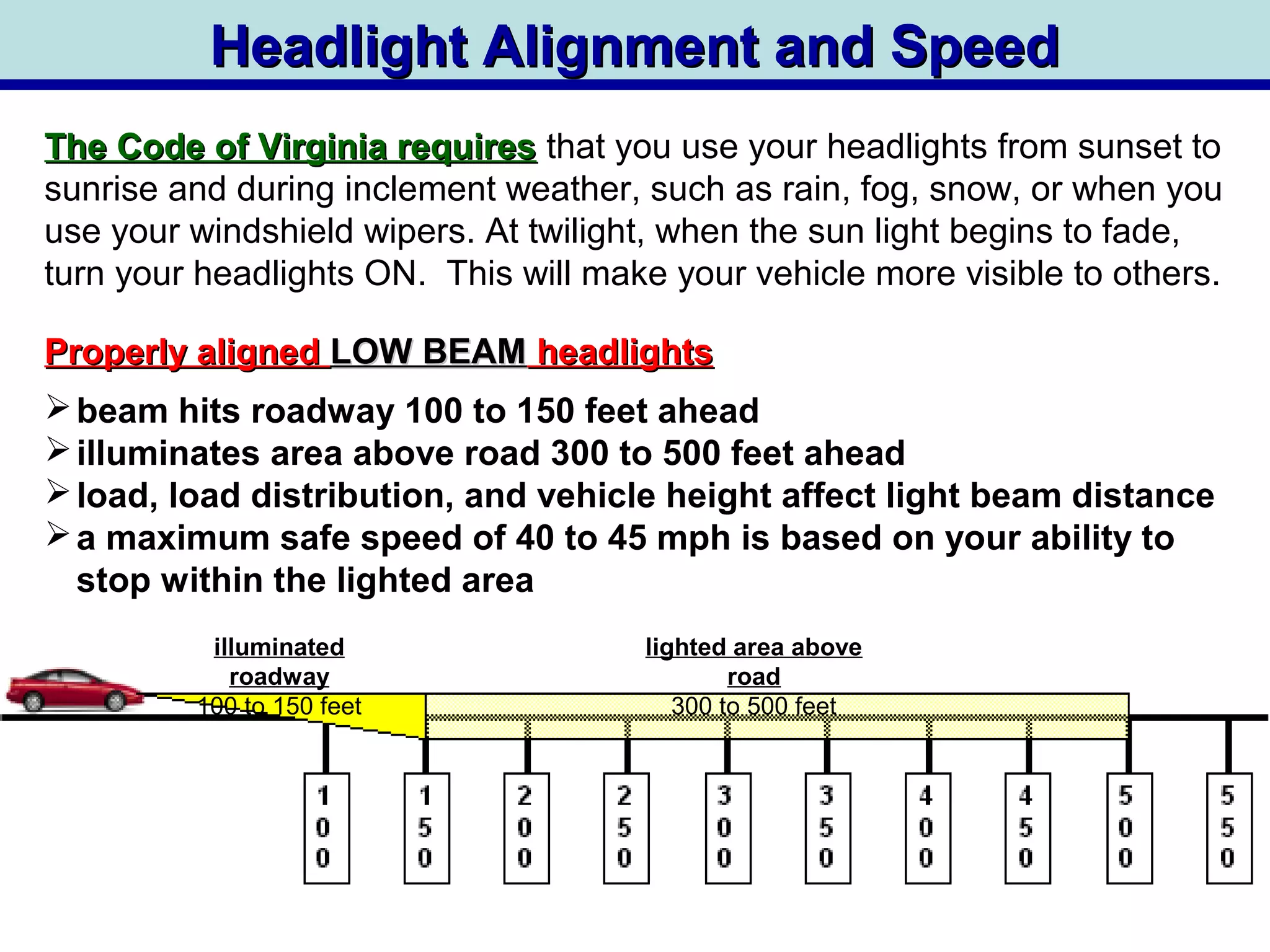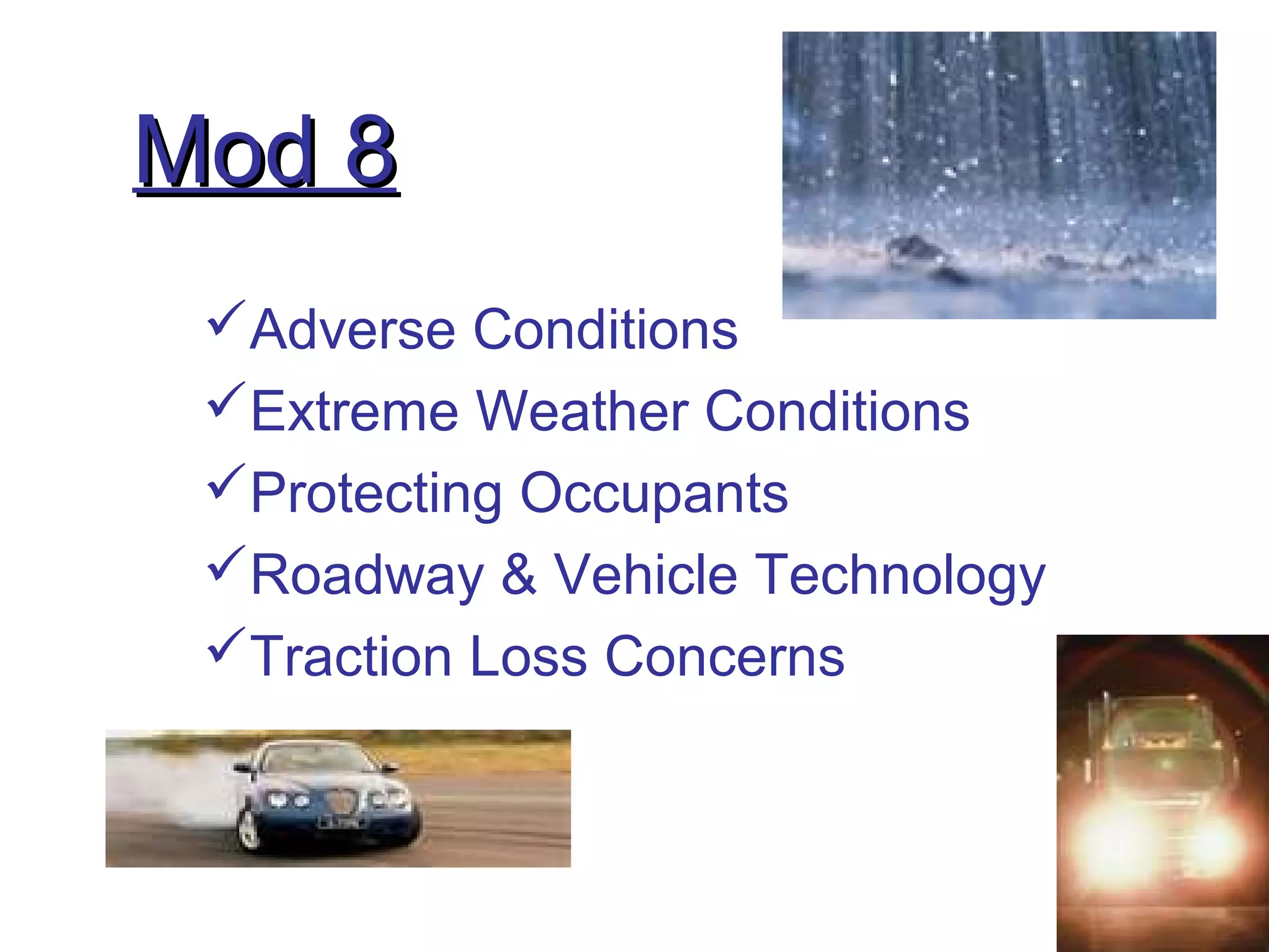 This document provides information on various driving safety topics such as headlight alignment, overdriving headlights, dealing with glare from other vehicles' headlights, fog conditions, winter weather conditions, hydroplaning, traction loss, and occupant protection. It discusses proper techniques for headlight alignment, determining safe speeds based on lighting conditions, adjusting mirrors to reduce glare, driving in fog and snow, determining water depth at low water crossings, using brakes to dry them, and minimizing glare. It also covers tips for dusty areas, underinflated tires, snow and ice conditions, dealing with wind, using safety restraints properly, airbag safety, and new automotive technologies that improve safety.