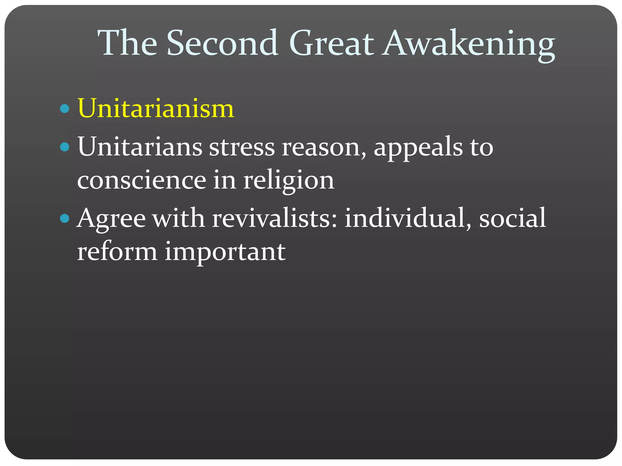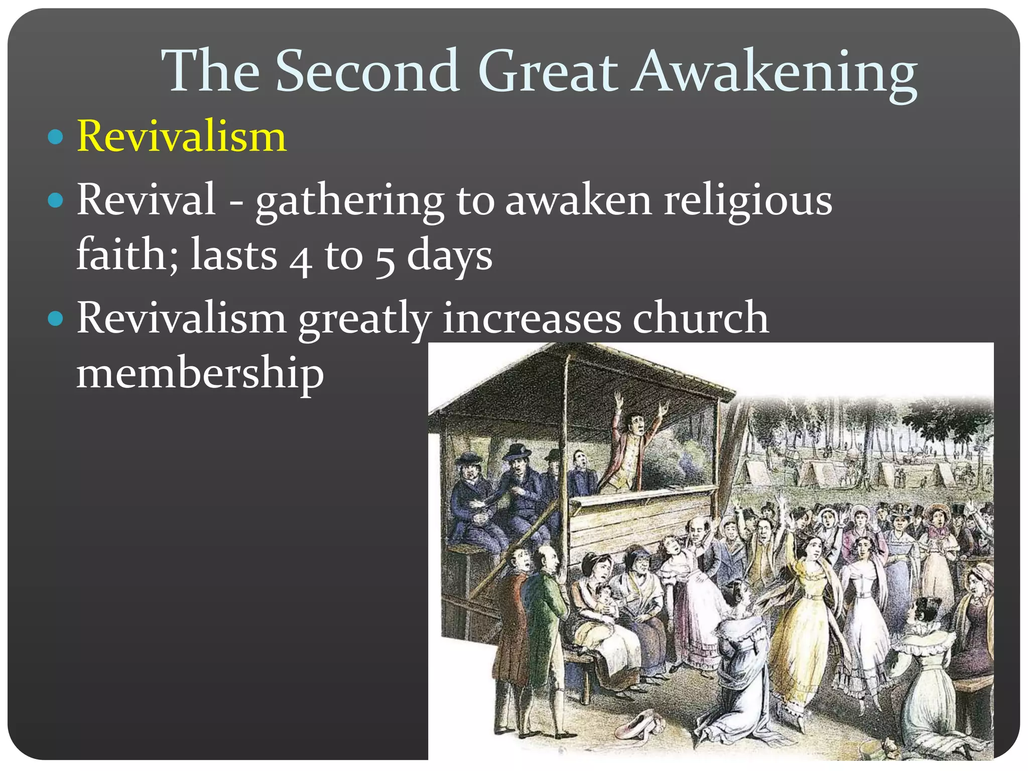 The Second Great Awakening saw a revival of religious faith through large camp meetings and revivals in the early 1800s. This led to growth in church membership and influenced other religious and social reform movements. Abolitionists like William Lloyd Garrison and Frederick Douglass advocated the immediate end of slavery through publications like The Liberator. The Underground Railroad helped fugitive slaves escape to freedom. Meanwhile, women's roles were expanding as they joined temperance and abolition societies, and the women's rights movement emerged with the Seneca Falls Convention in 1848.