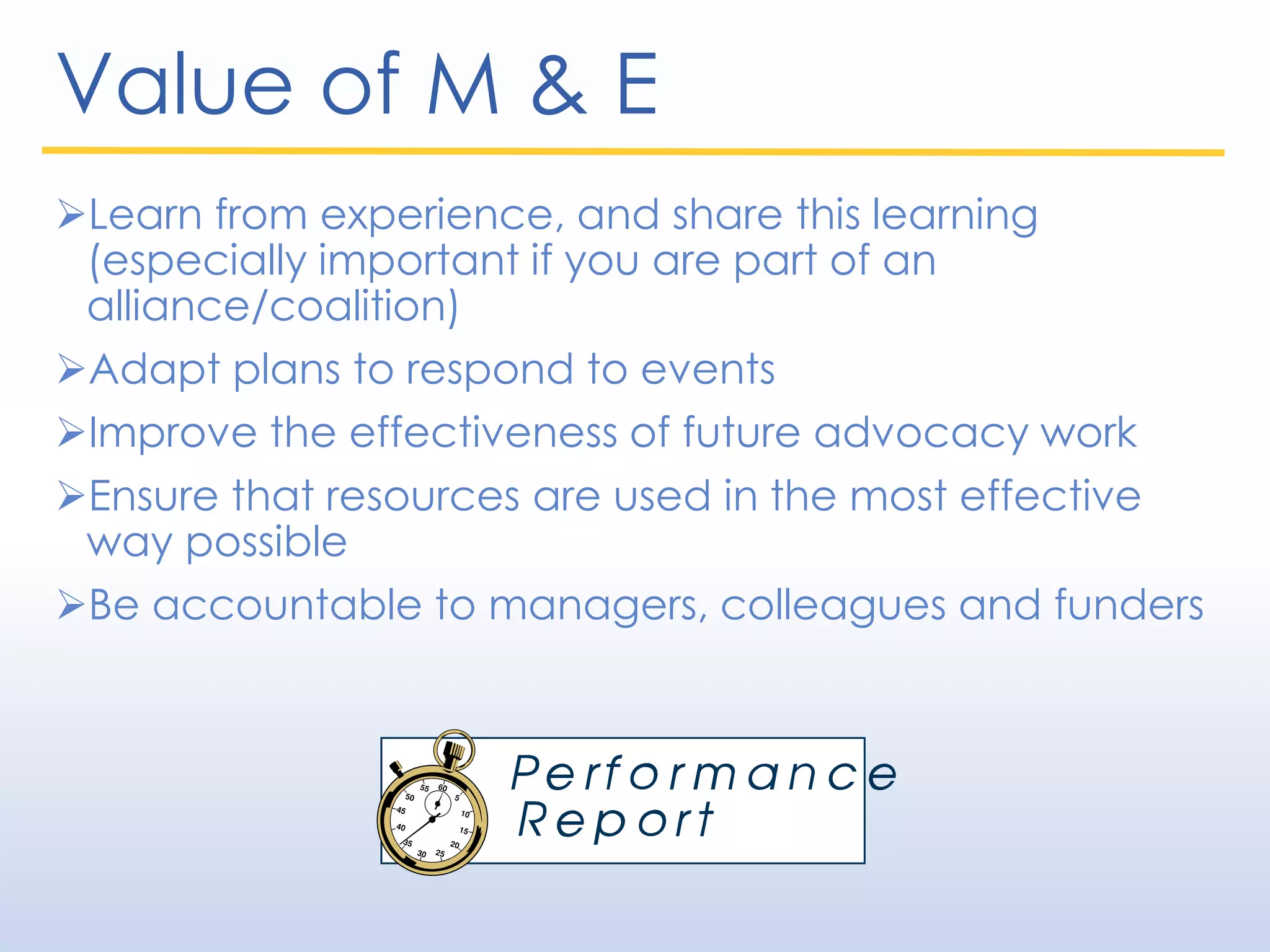 The document provides an overview of monitoring and evaluation (M&E) in advocacy, emphasizing the importance of learning from experience, adapting plans, and improving future effectiveness. It distinguishes between monitoring, which tracks implementation, and evaluation, which assesses results at specific points in time, including key methods for data collection and the use of indicators. The purpose of M&E is to enhance organizational learning and continuous improvement in advocacy efforts, ultimately leading to significant changes in animal welfare policies and practices.